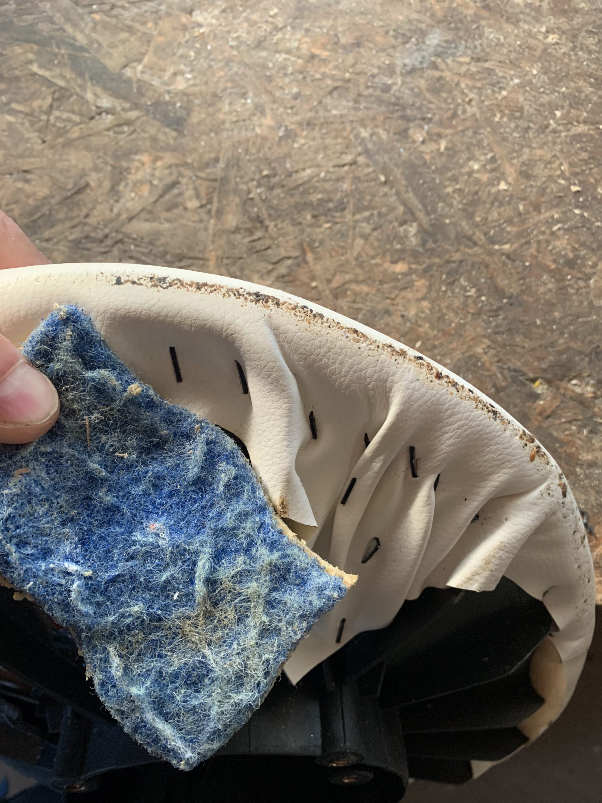 La première étape est de nettoyer l’assise et la coque, puis enlever les agrafes pour récupérer la finition et la mousse.