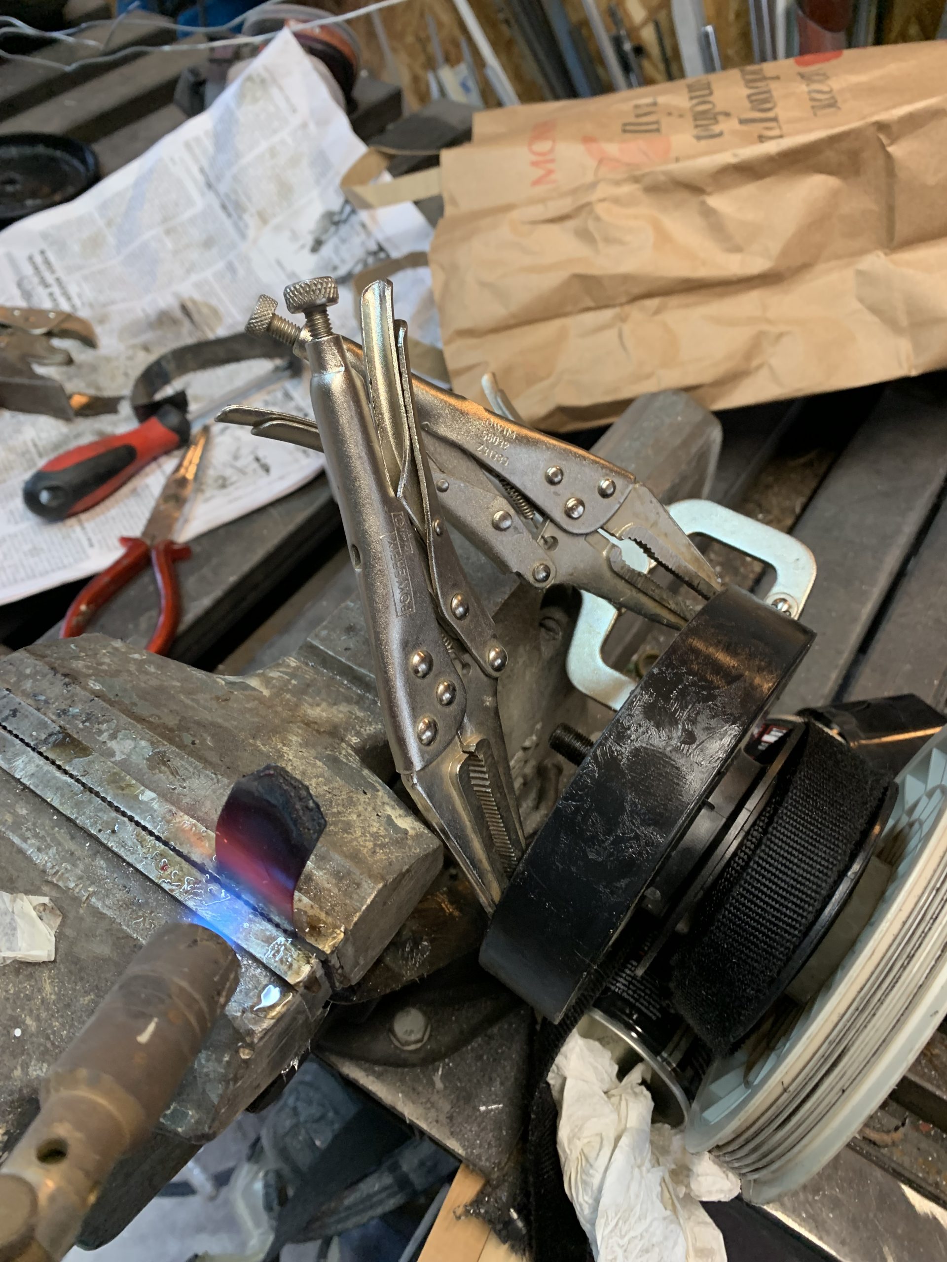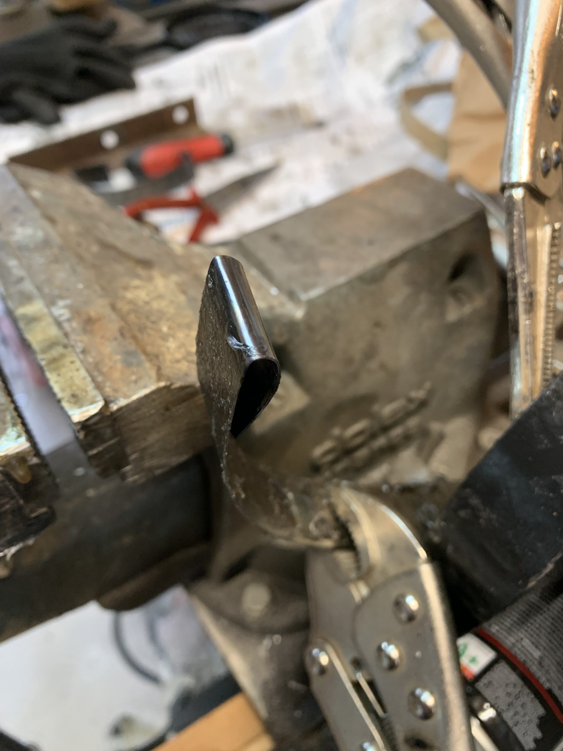 L’acier à ressort est traité et si on essaye de le plier il casse. Je l’ai donc chauffé localement pour le plier et quelques coups de marteau ont suffi.