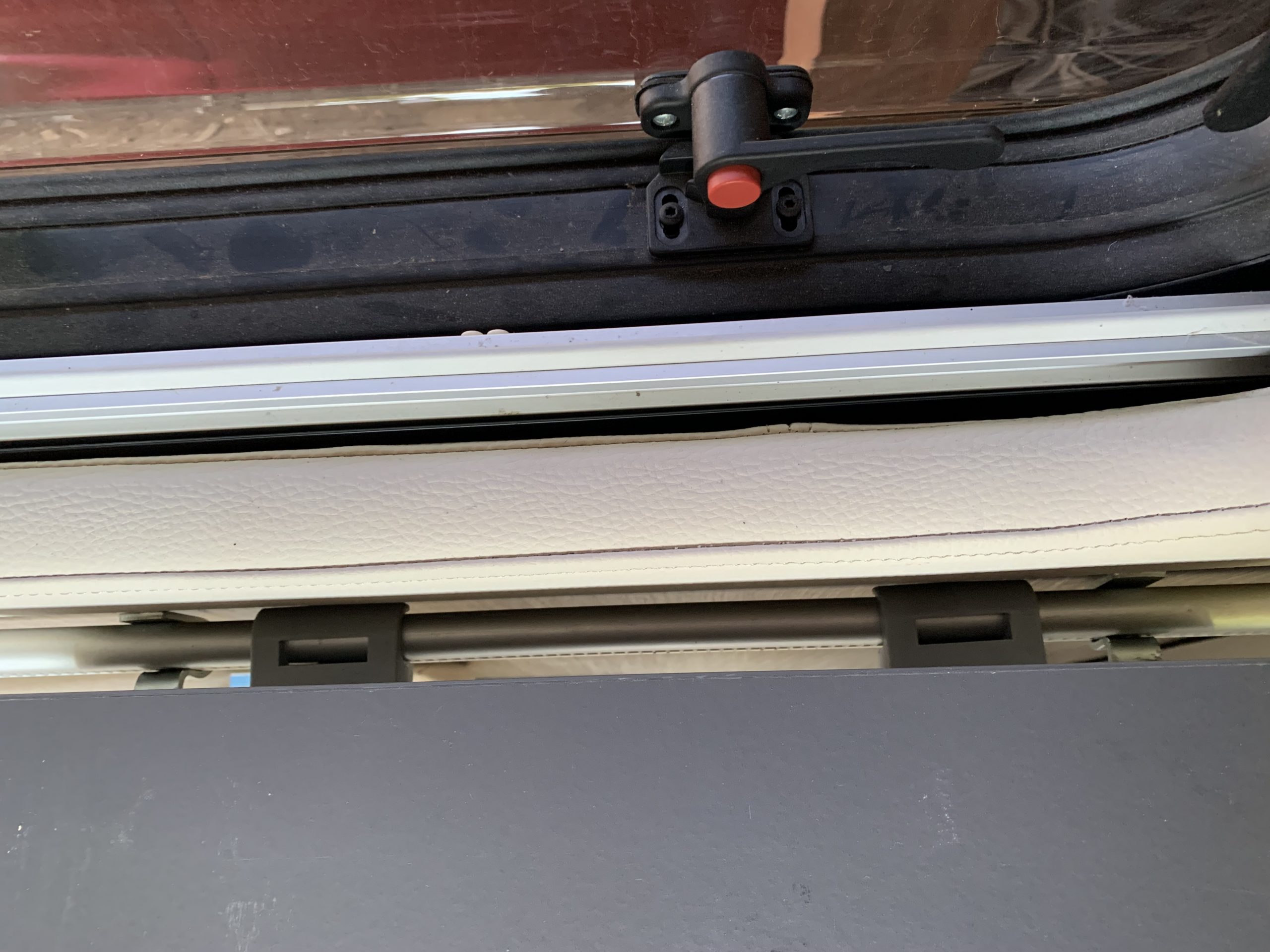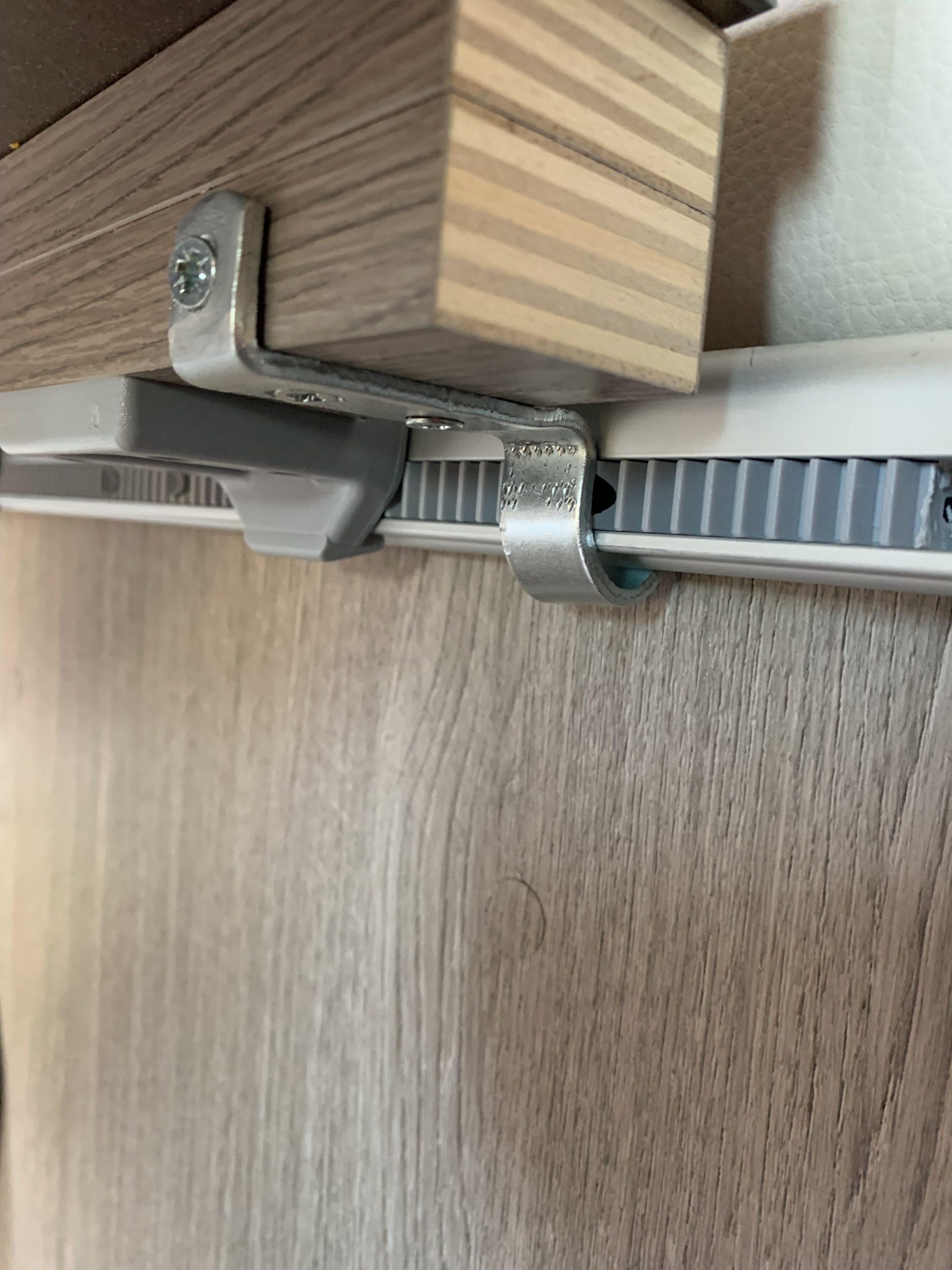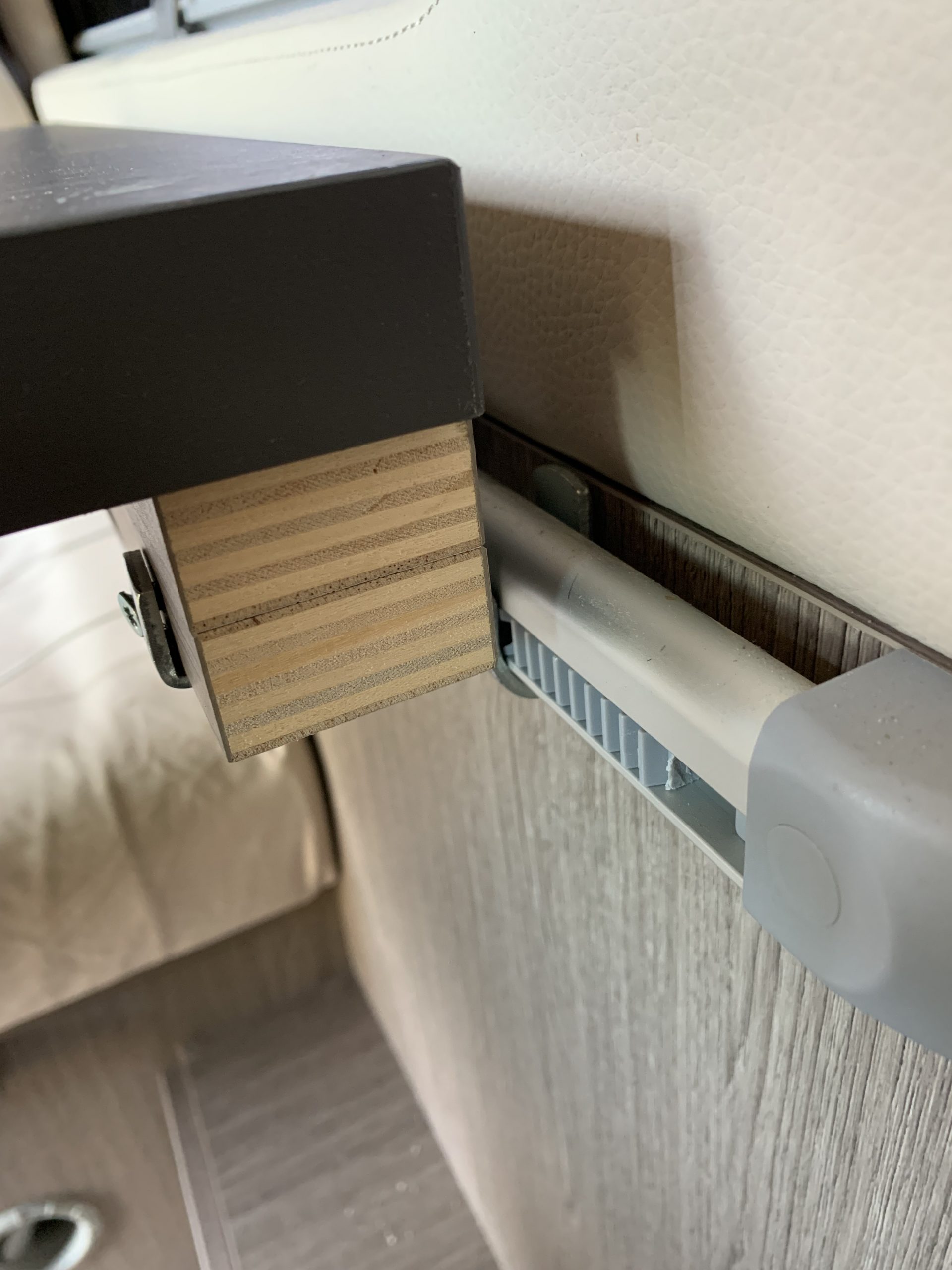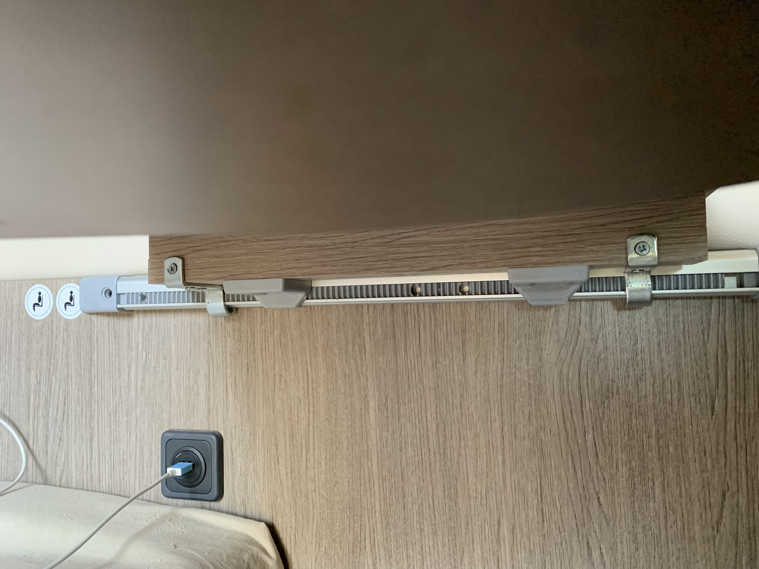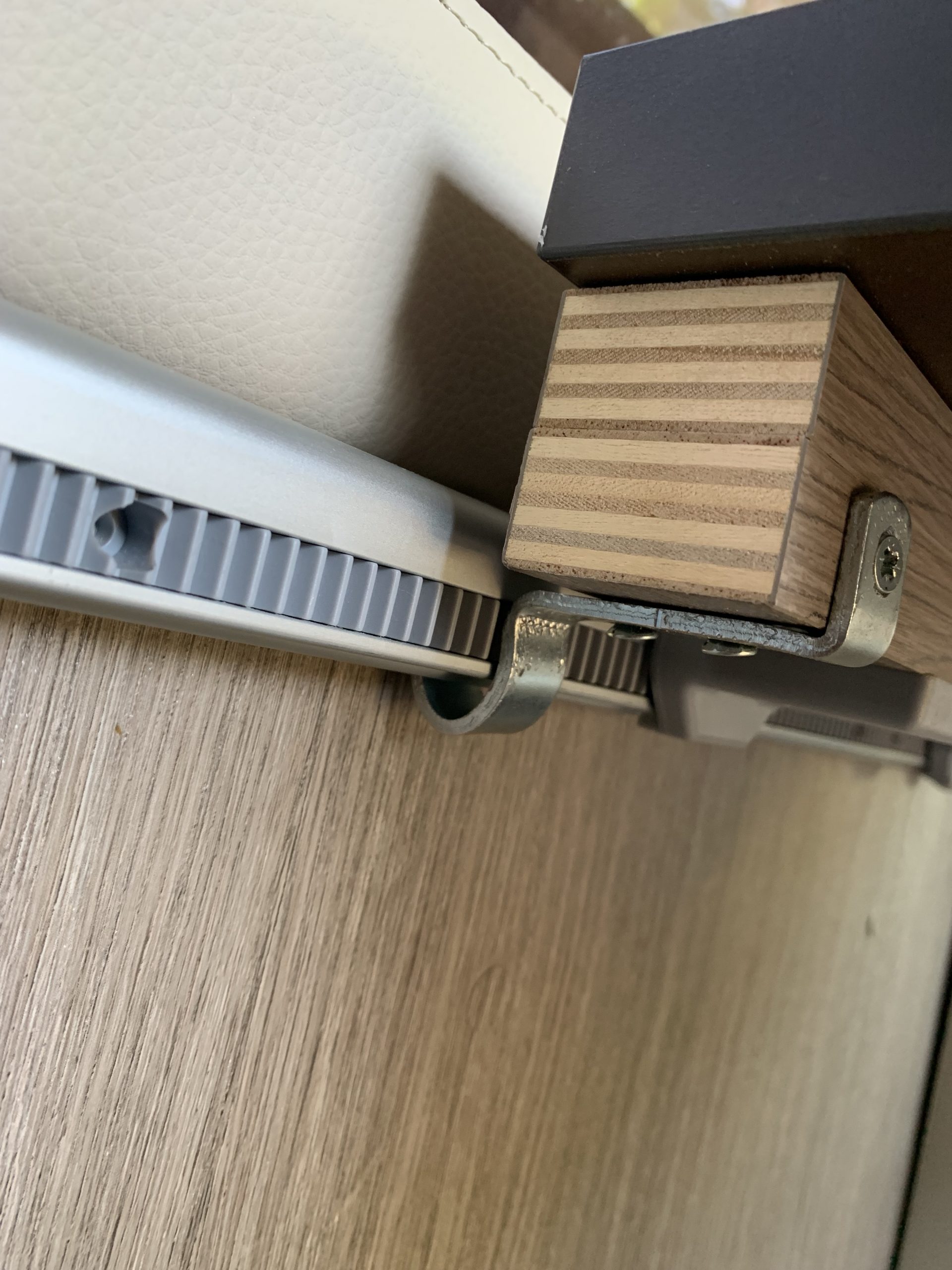 Le problème est que pour rendre la table facilement démontable, sa fixation initiale  n’est pas très ‘positive’. De plus le siège du conducteur vient souvent en butée contre la table et peut la mettre sous contrainte, et il est arrivé qu’elle se décroche en roulant. Pour arranger celà j’ai ajouté des pattes en dessous qui complètent la fixation et assurent la fixation de la table tout en gardant la capacité de la déplacer lateralement  sur son rail.