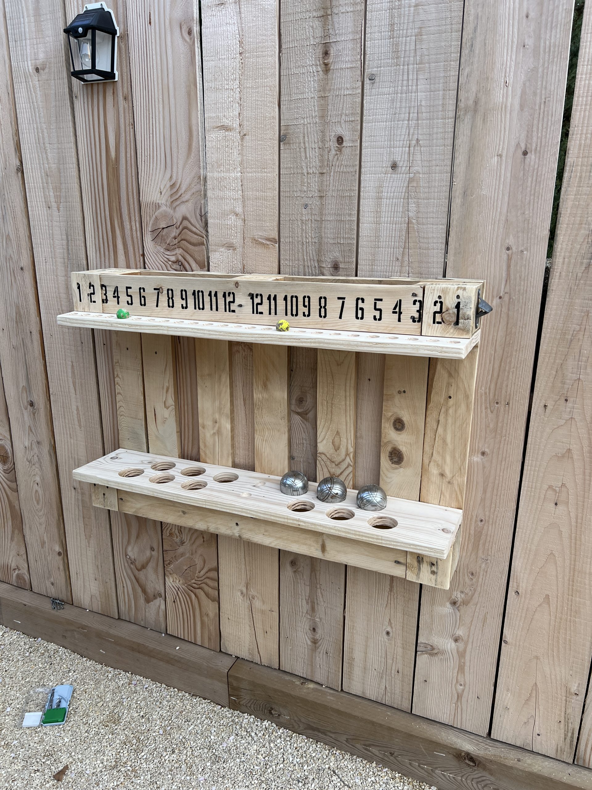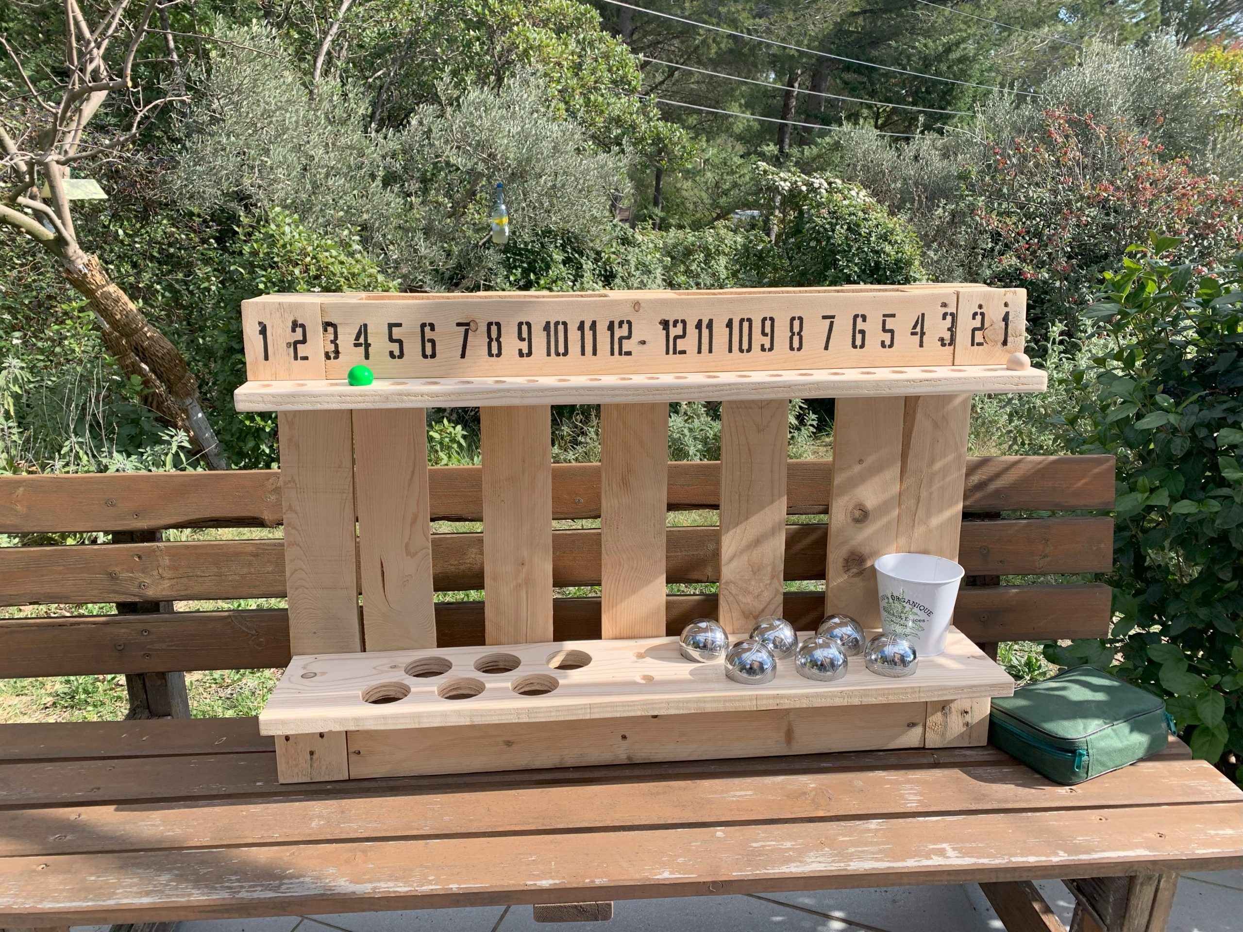 Il s’agit de compter les points, stocker les boules, ouvrir les bieres, poser les boissons. Nous avons vu plusieurs réalisations sur Pinterest, et c’était aussi une idée de Mutiel.