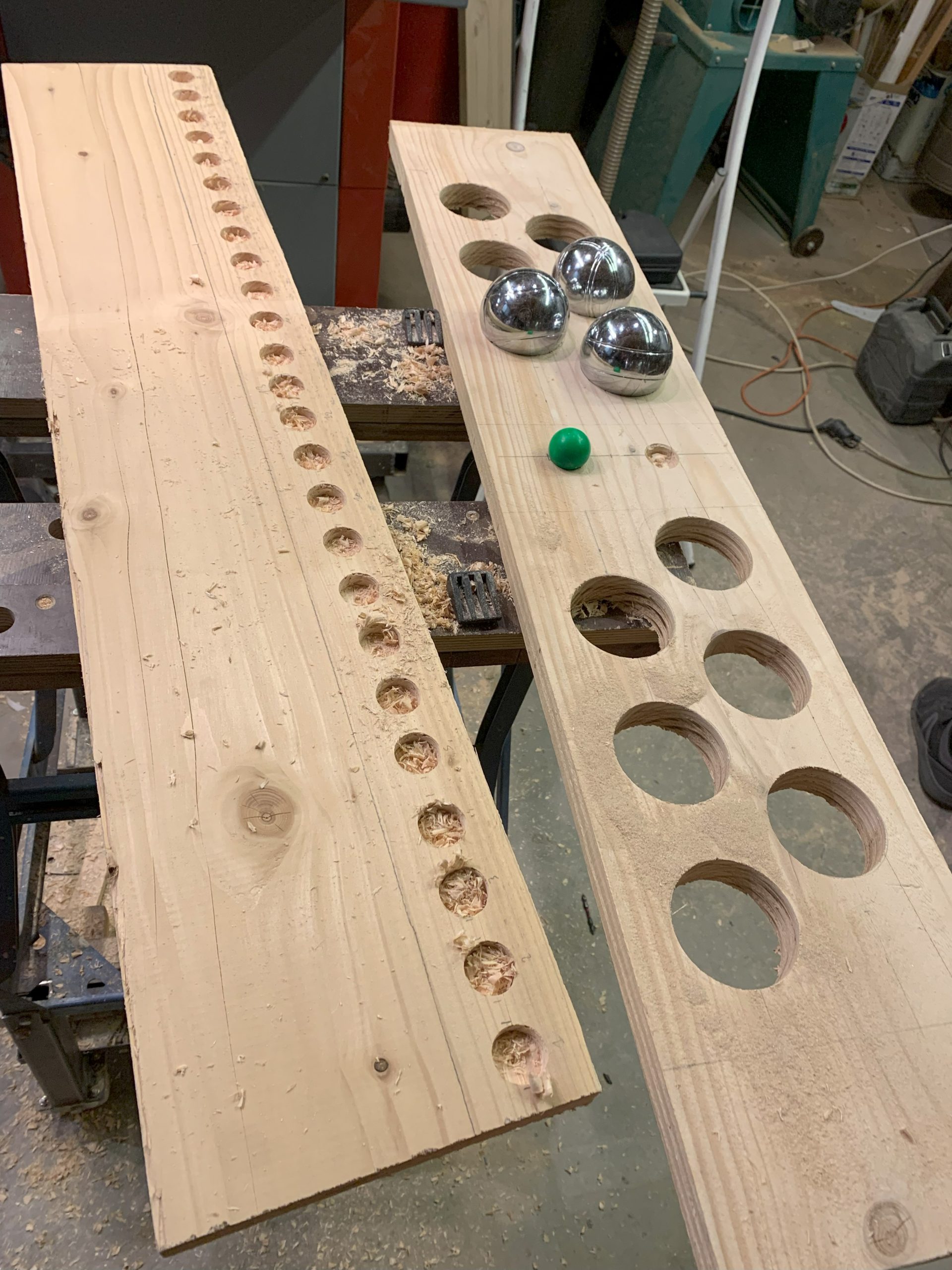 Jérémie a un peu galéré pour faire les trous pour les boules à la scie cloche (en fait pour décoincer le rond de la scie).