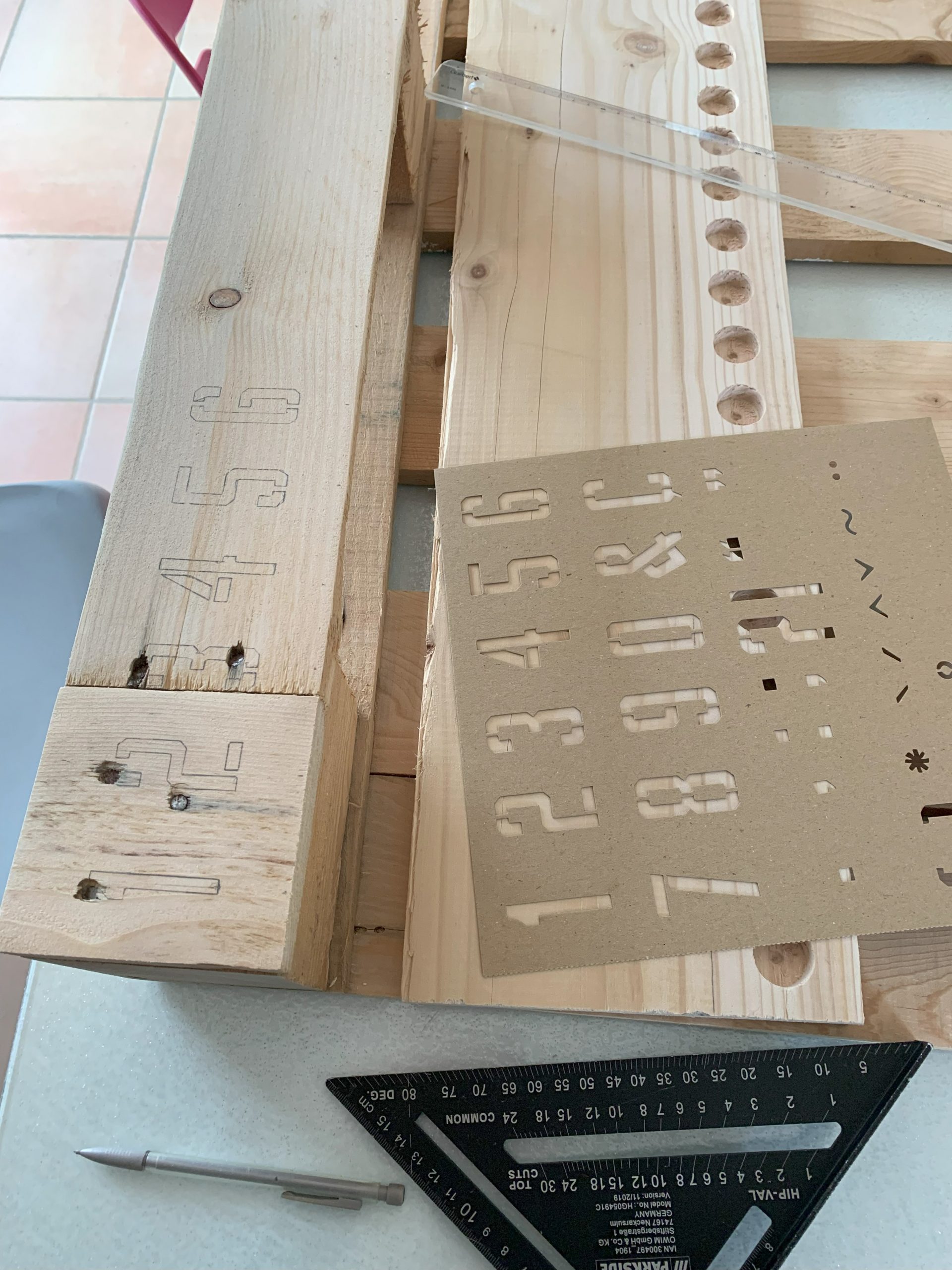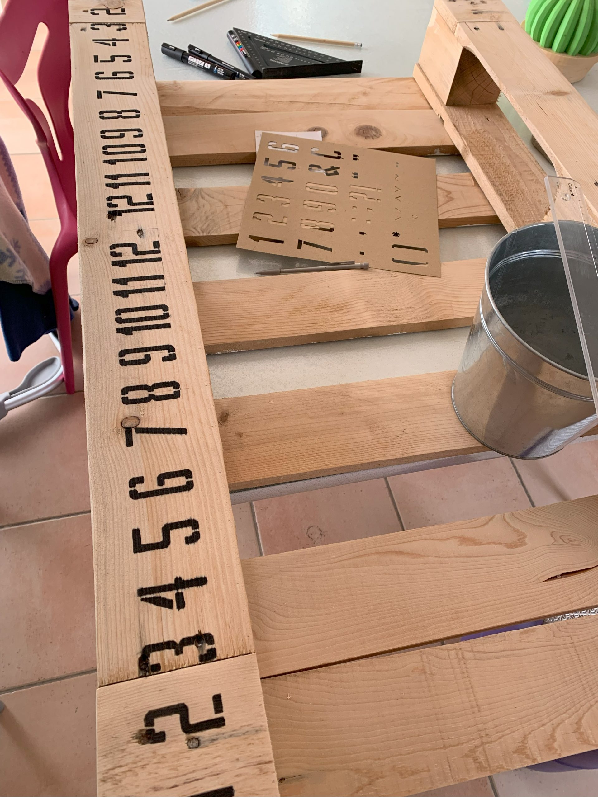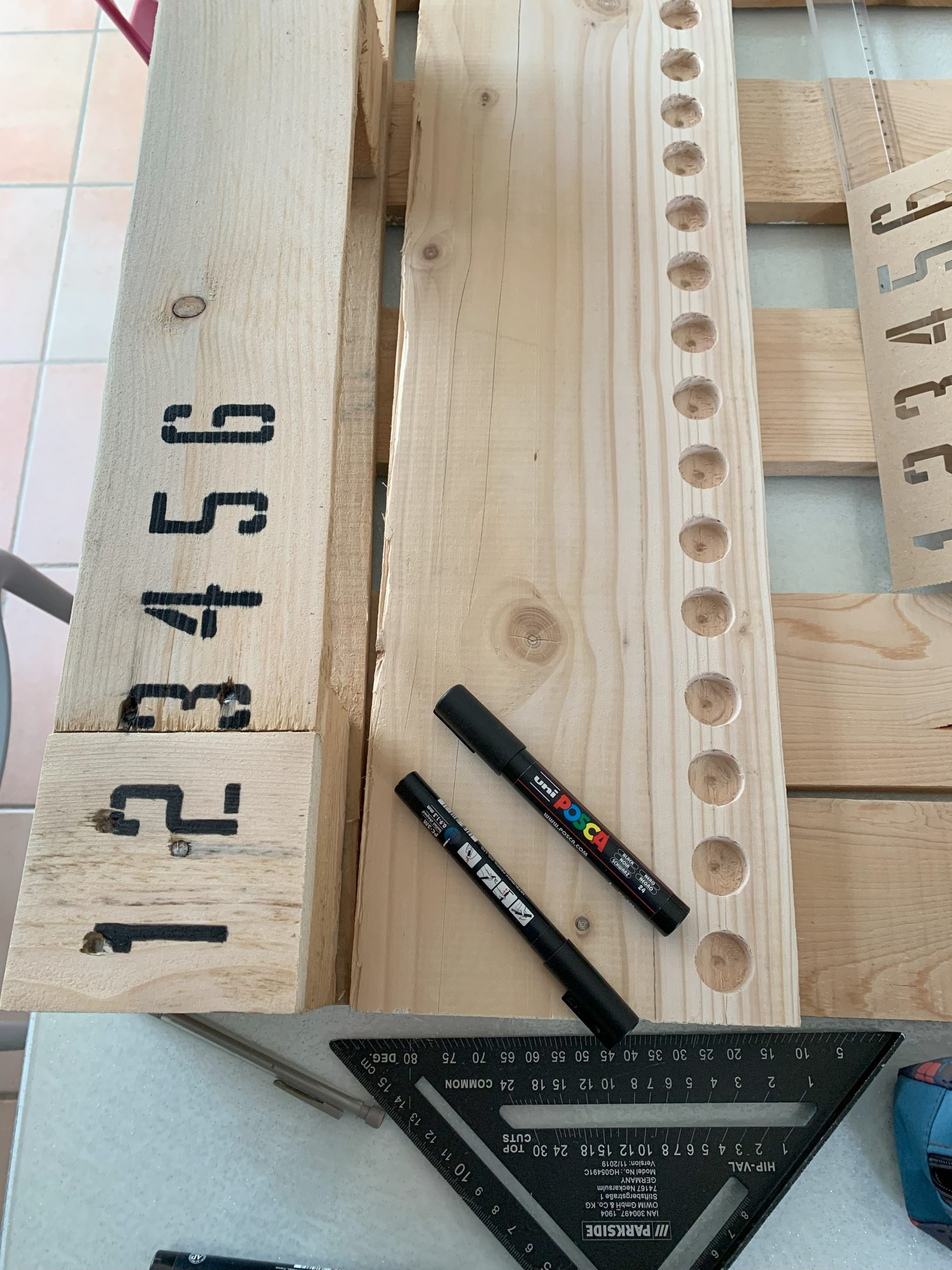 Pour les numéros j’ai utilisé des pochoirs. J’ai reporté le dessin au crayon et j’ai peint les numéros au Posca noir. C’est un peu long mais ca marche. Comme je n’avais pas trop de place je n’ai pas fait le 13 car de toutes façons quand on y arrive on a gagné.