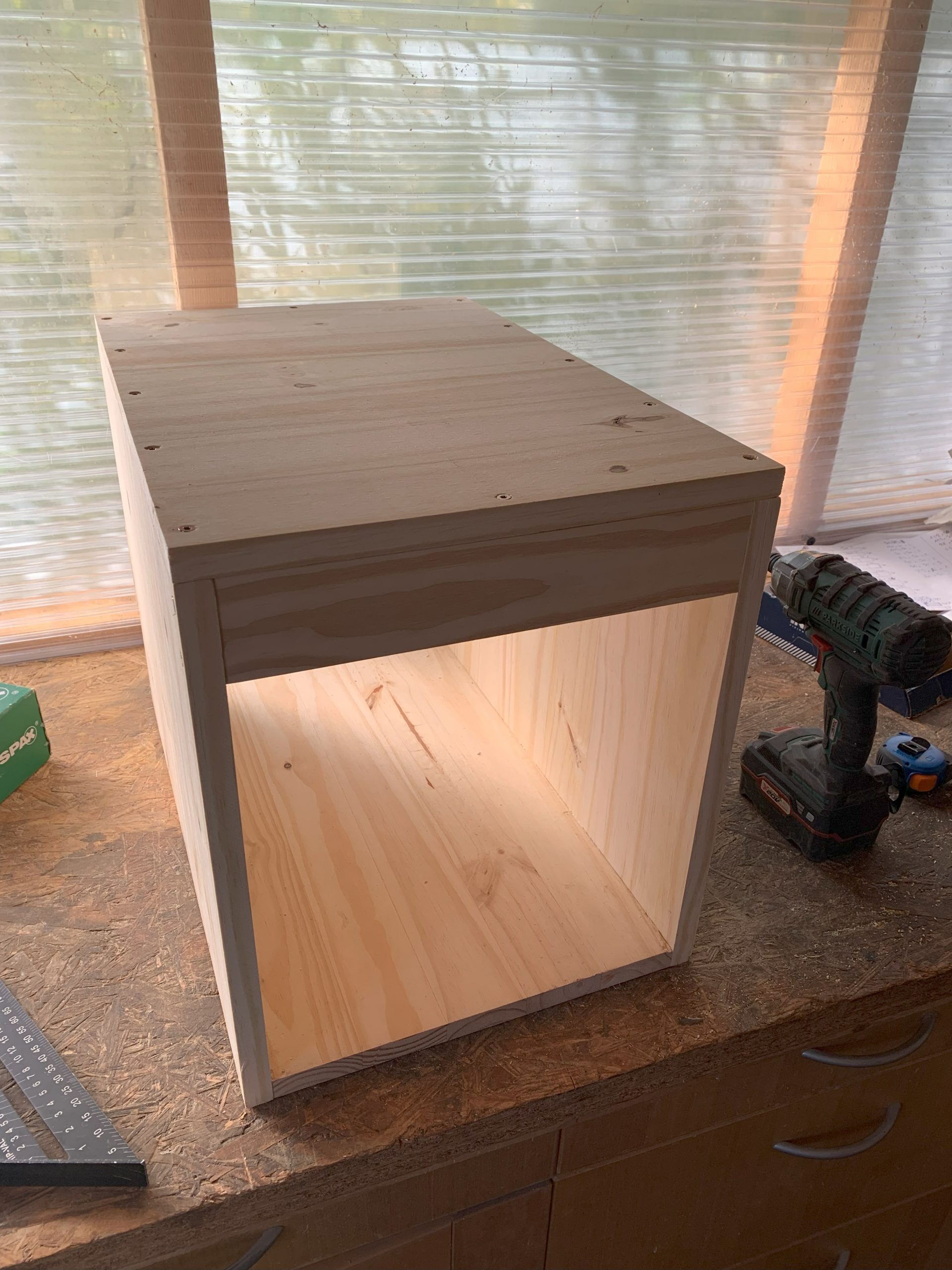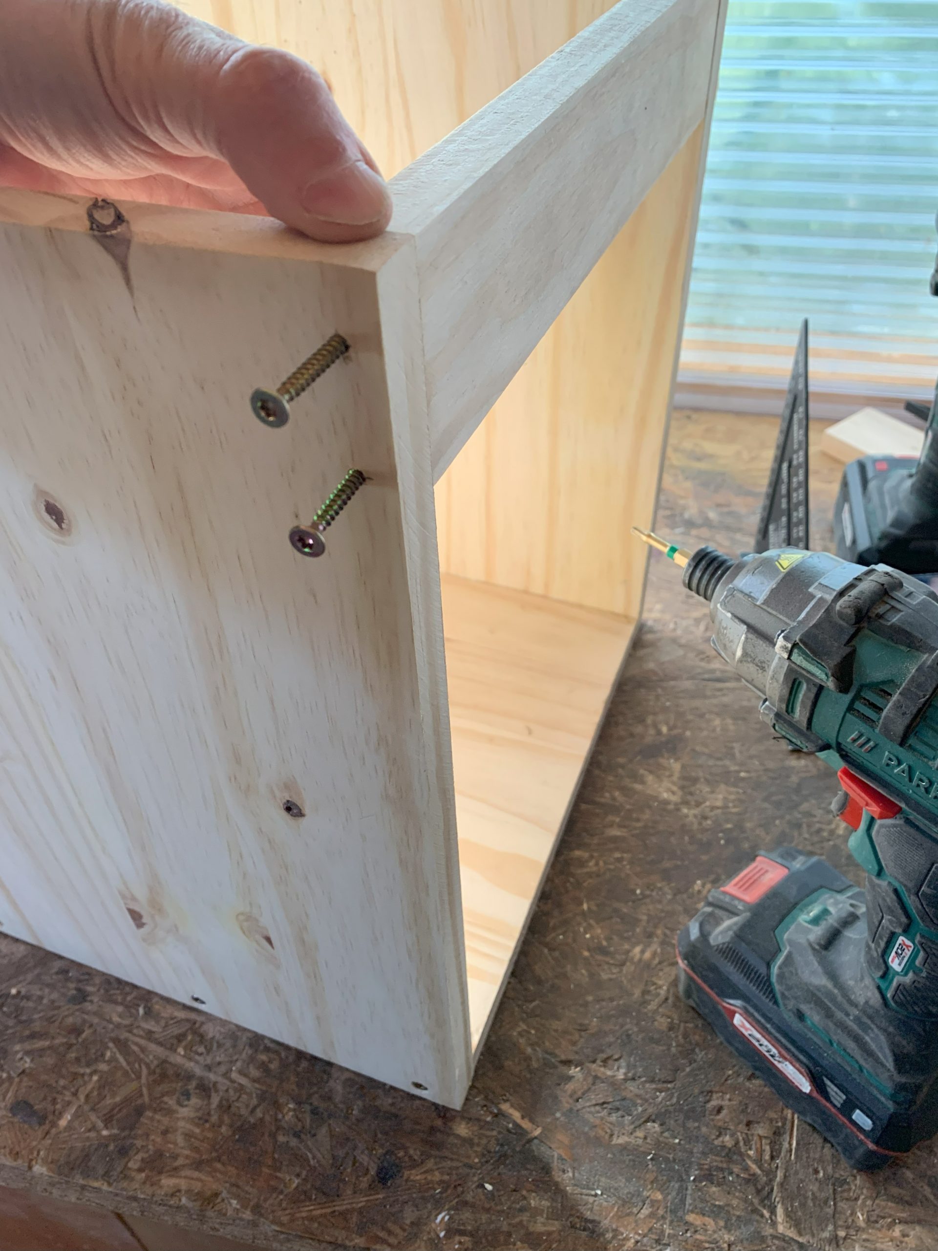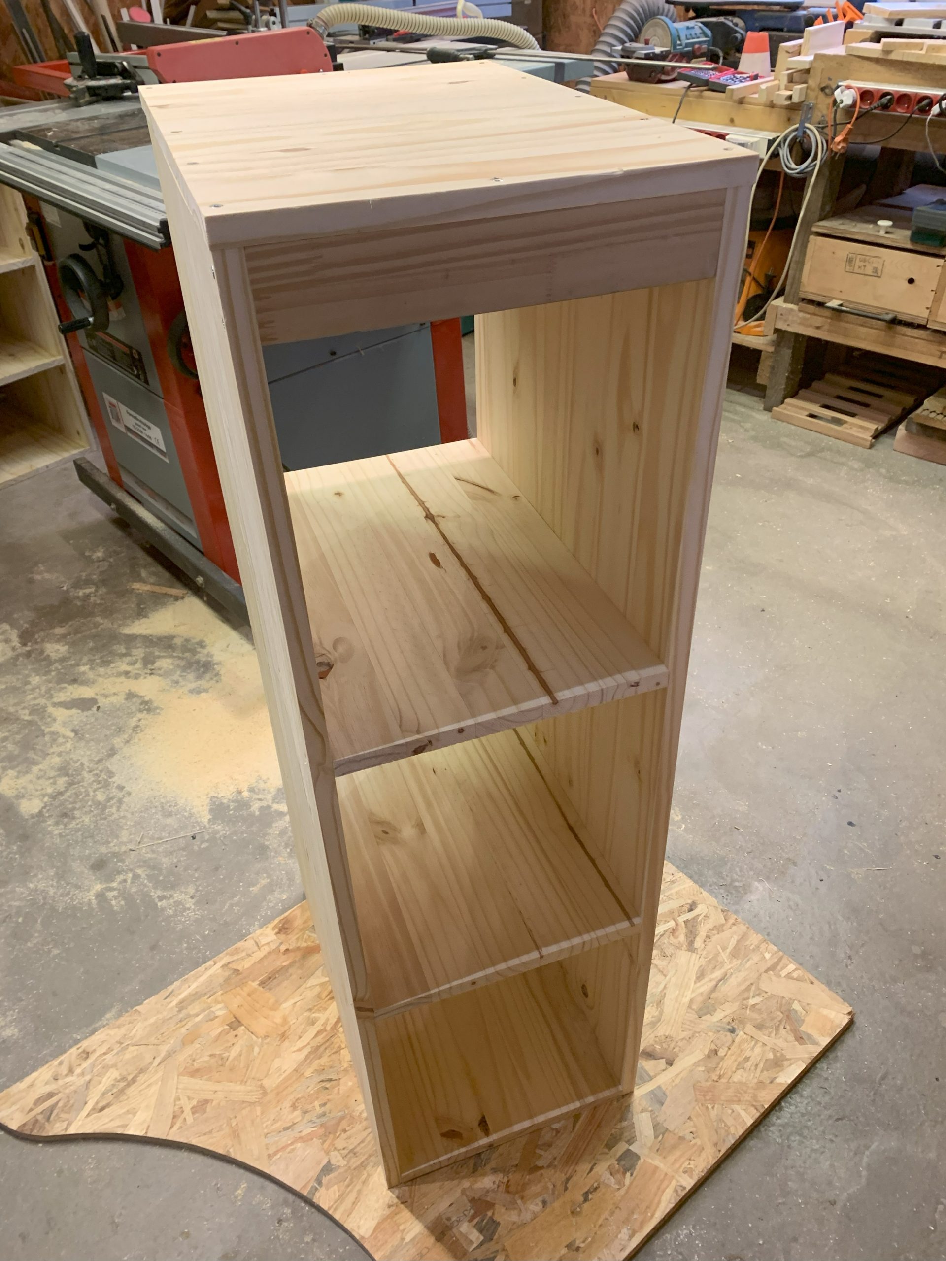 J’ai un moment imaginé faire des assemblages collés à lamelles, mais je me suis dit que des vis cela pouvait être assez propre aussi et surtout, beaucoup plus simple à faire. En bas, les vis traversent les cotés et sont vissées dans l’épaisseur du fond. En haut les vis traversent la planche du dessus et sontvissées dans l’épaisseur des montants. Celà s’est bien passé, et seules 2 ou 3 vis sont sorties de l’épaisseur mais c’est facile à corriger.
