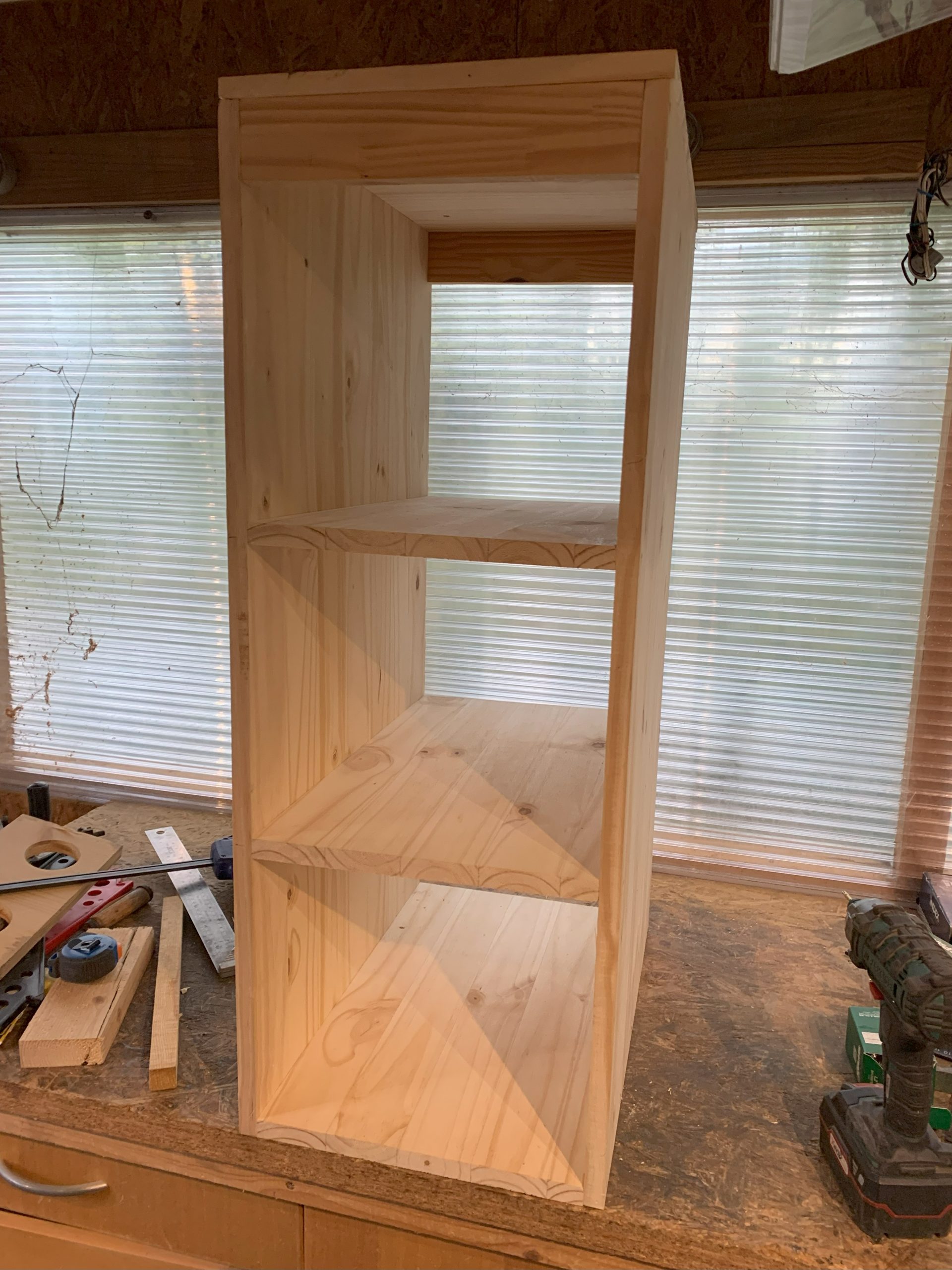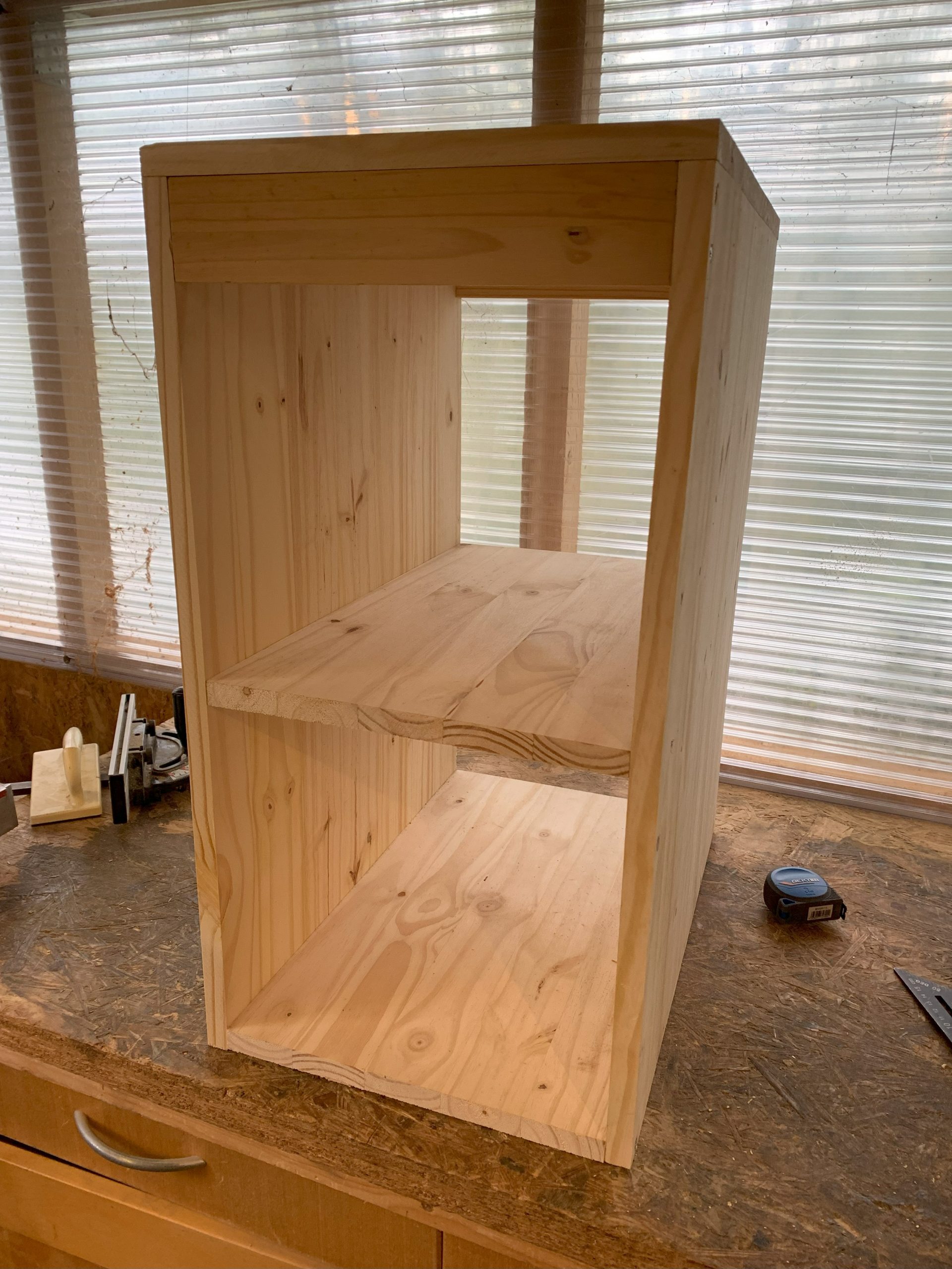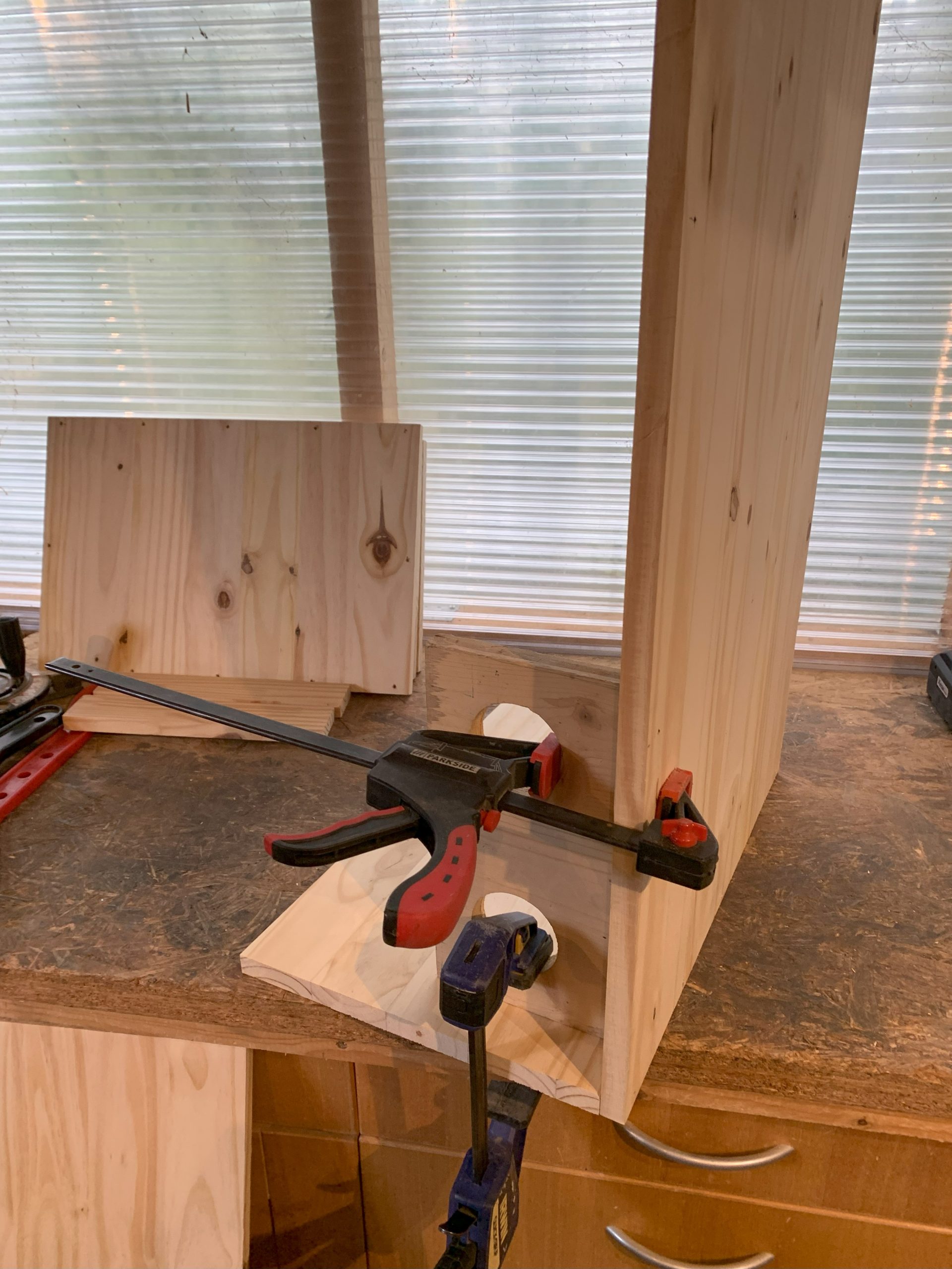 J’ai un moment imaginé faire des assemblages collés à lamelles, mais je me suis dit que des vis cela pouvait être assez propre aussi et surtout, beaucoup plus simple à faire. En bas, les vis traversent les cotés et sont vissées dans l’épaisseur du fond. En haut les vis traversent la planche du dessus et sontvissées dans l’épaisseur des montants. Celà s’est bien passé, et seules 2 ou 3 vis sont sorties de l’épaisseur mais c’est facile à corriger.