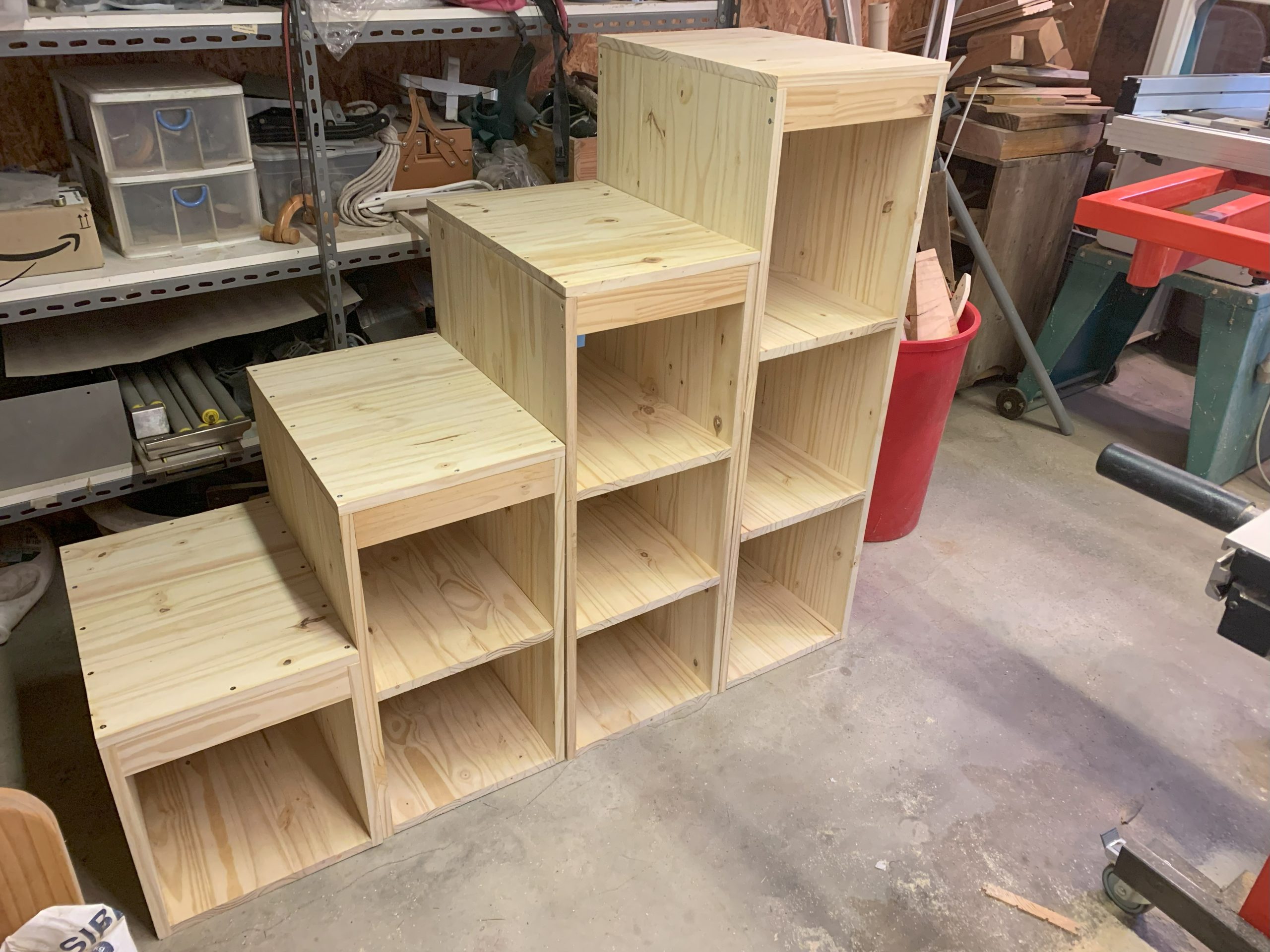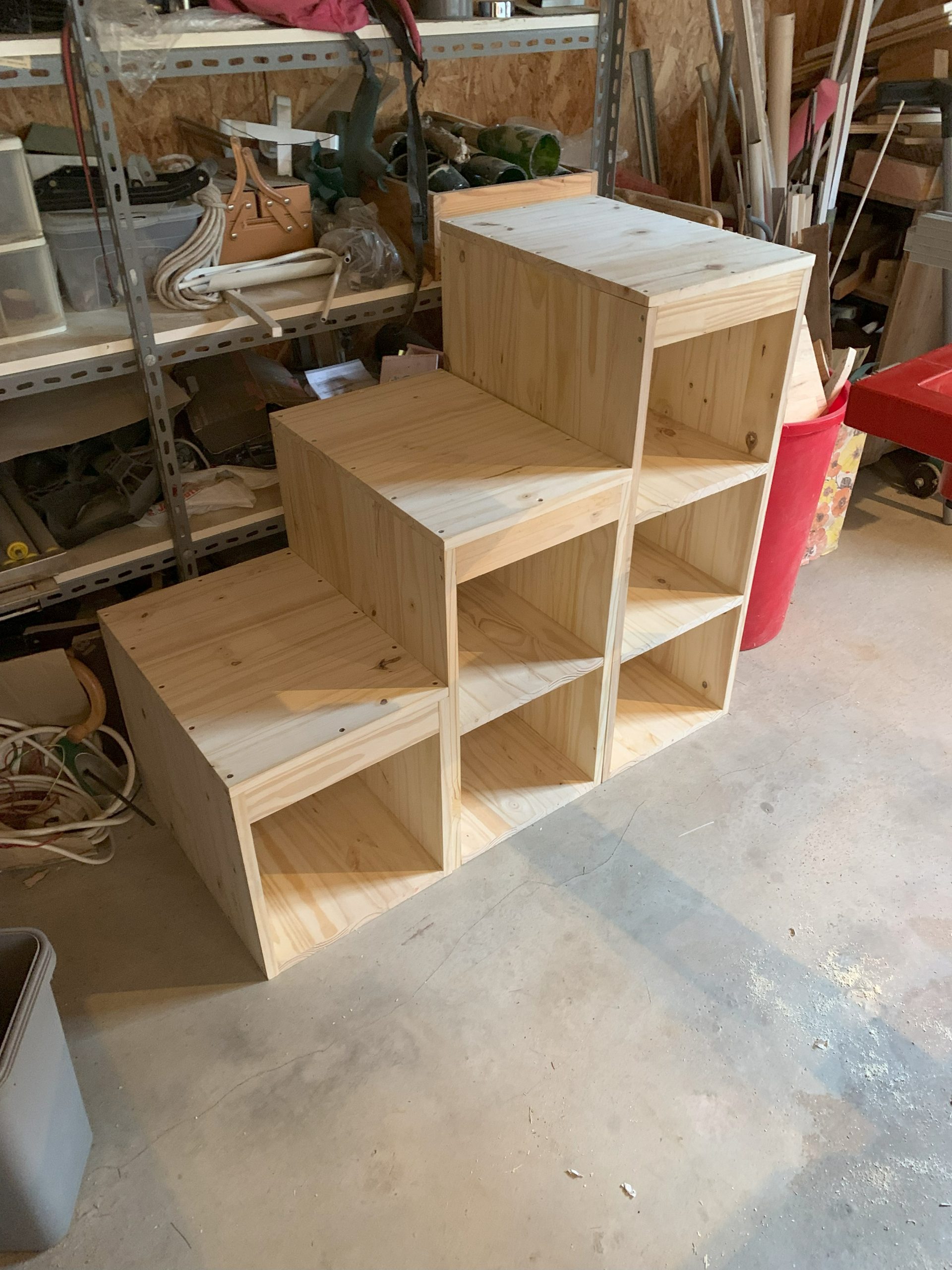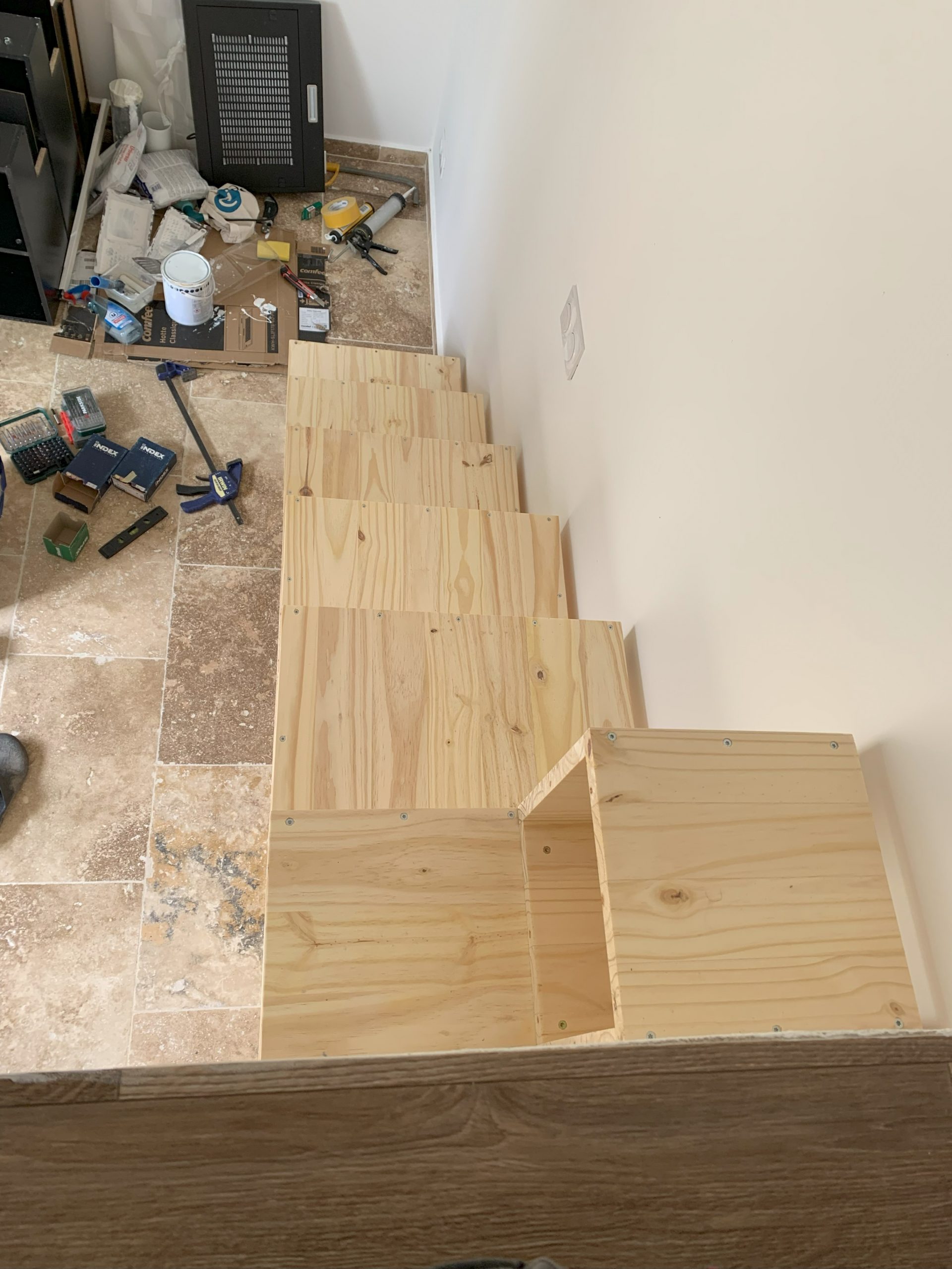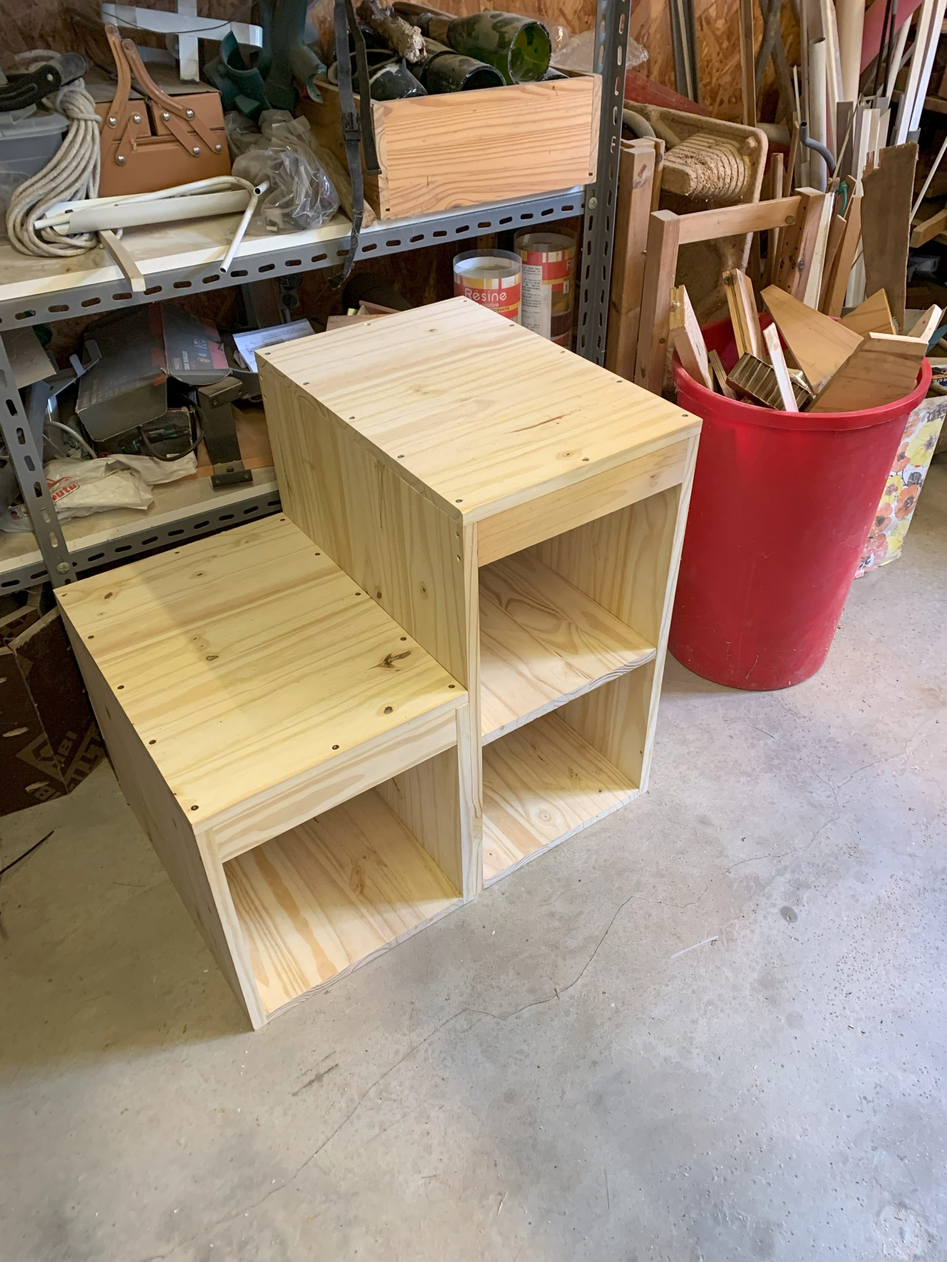 J’ai décidé de faire des blocs séparés et de les assembler sur place. J’ai pensé que ce serait plus facile à transporter, et aussi que ce serait plus solide si la planche du haut qui sert de marche repose sur 2 montants.