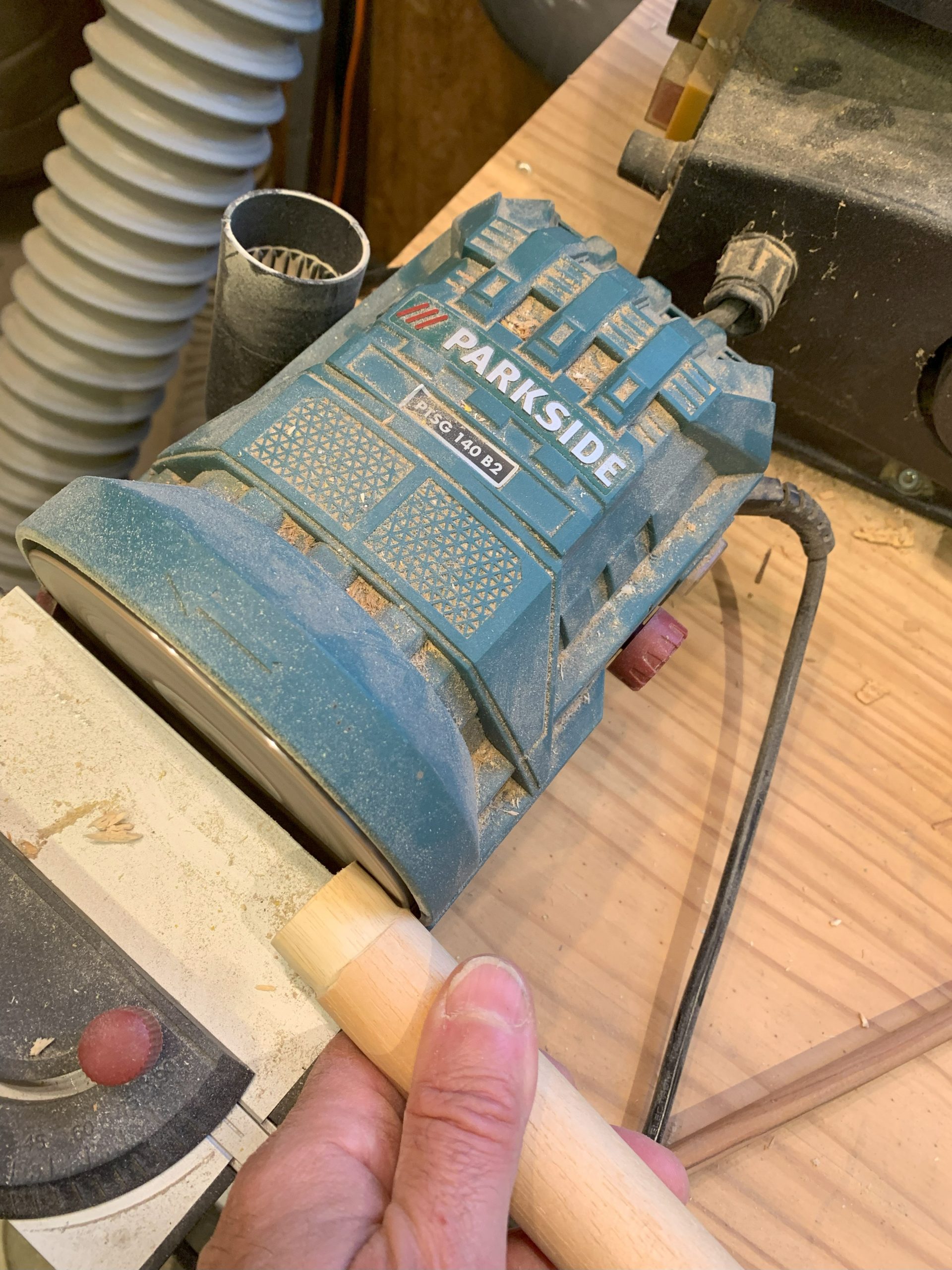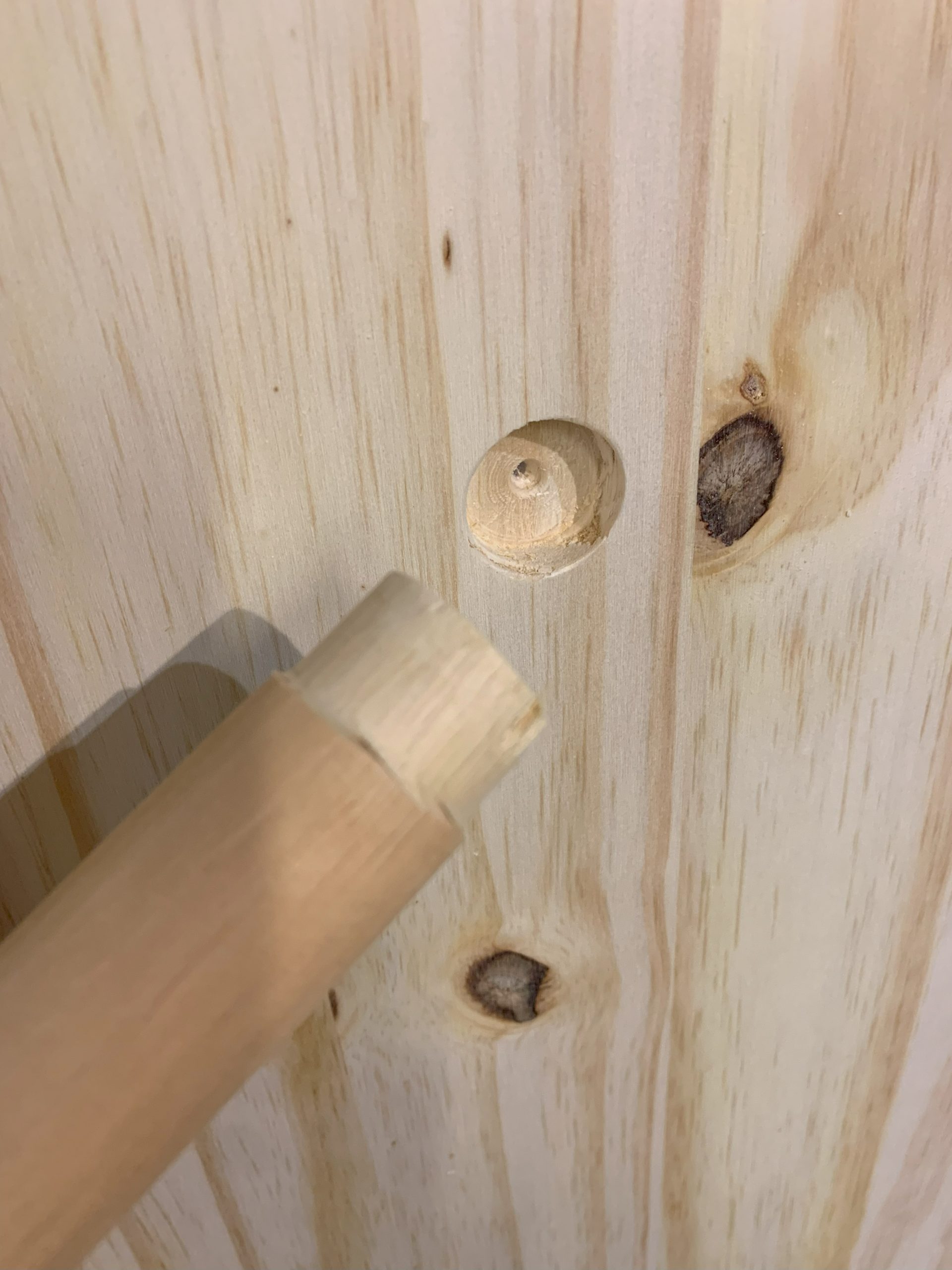 Pour le dernier bloc qui est le plus large et le plus haut, j’ai fait une penderie plutot que des étagères. J’ai utilisé un bout de tringle à rideau en bois et comme je n’avais pas de fraise du bon diamètre j’ai du un peu réduire le diamètre en extrémité.