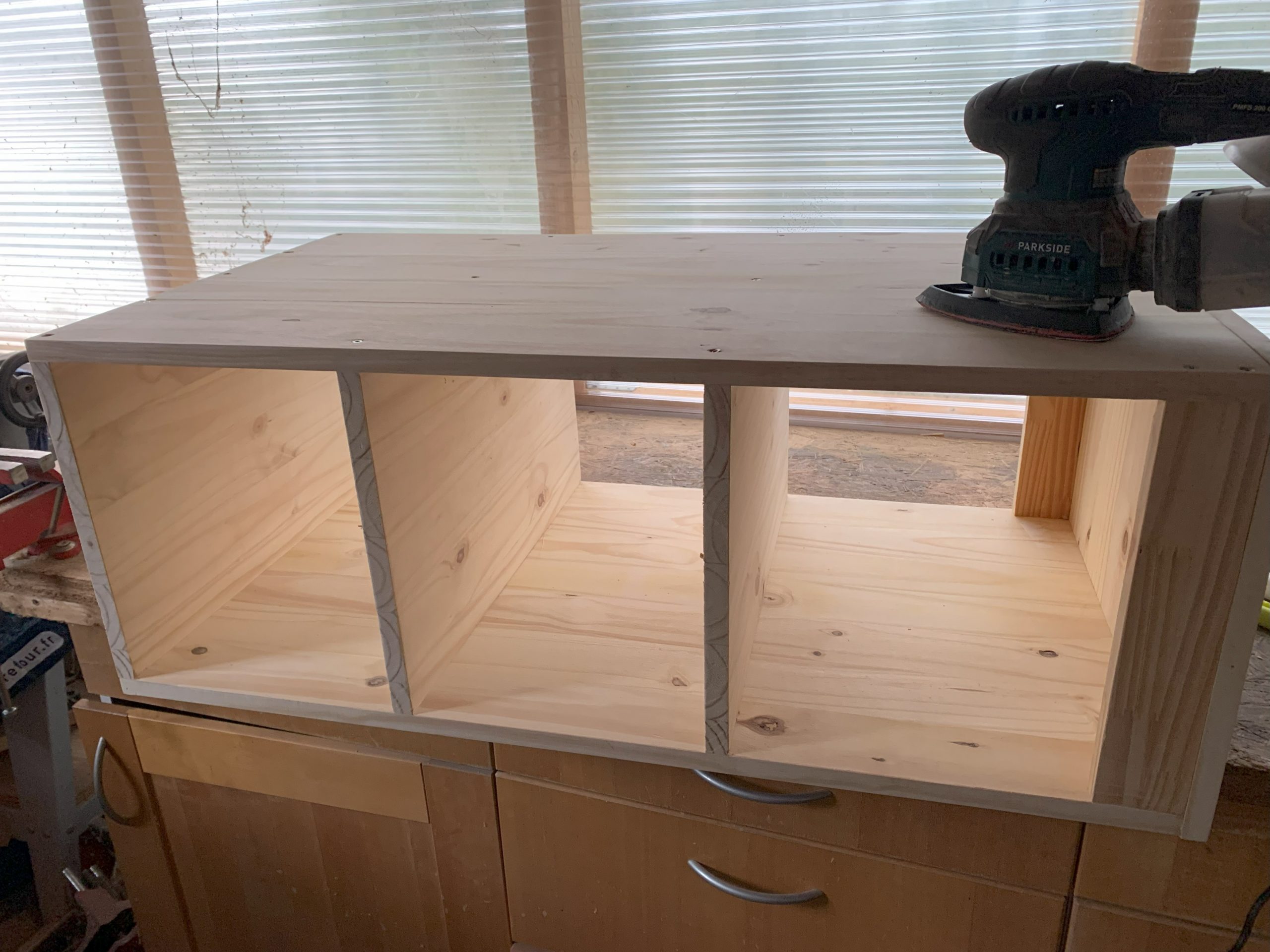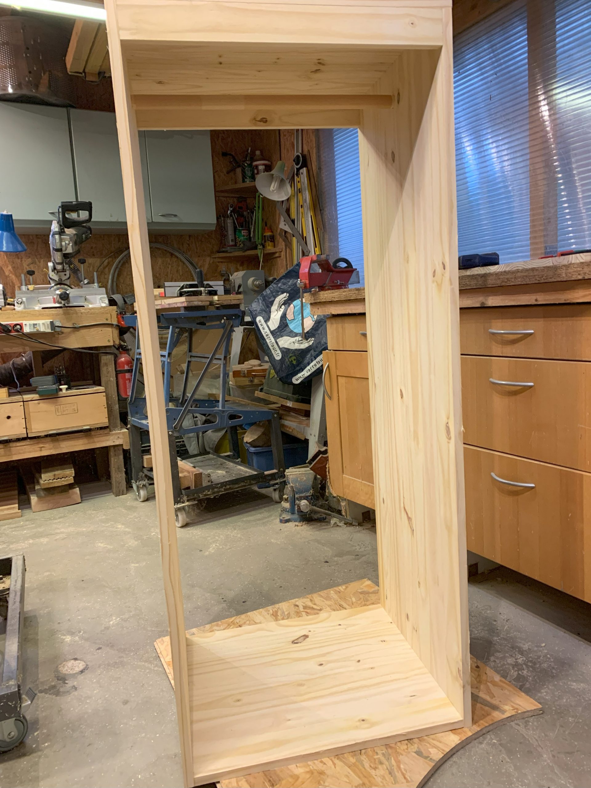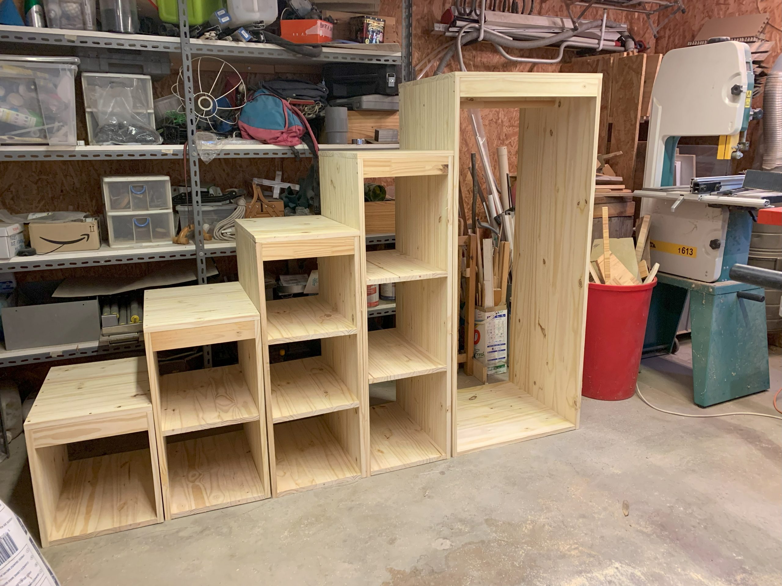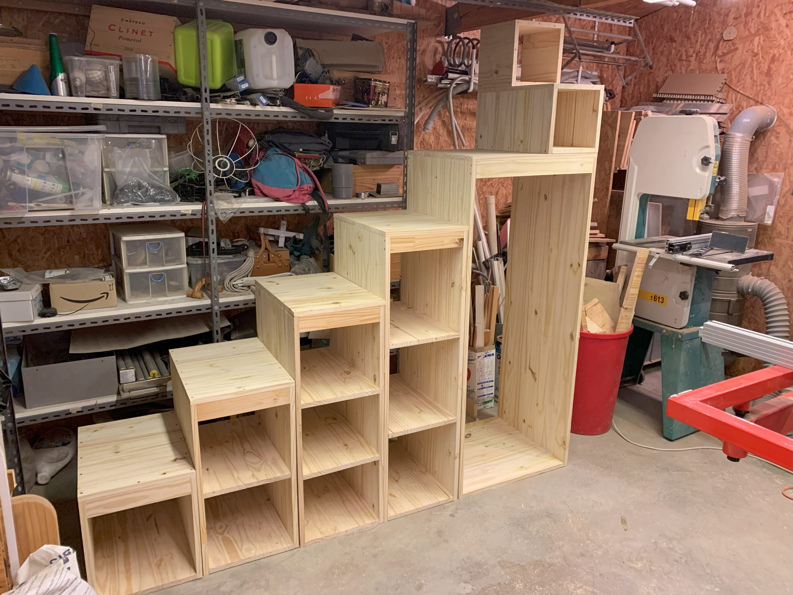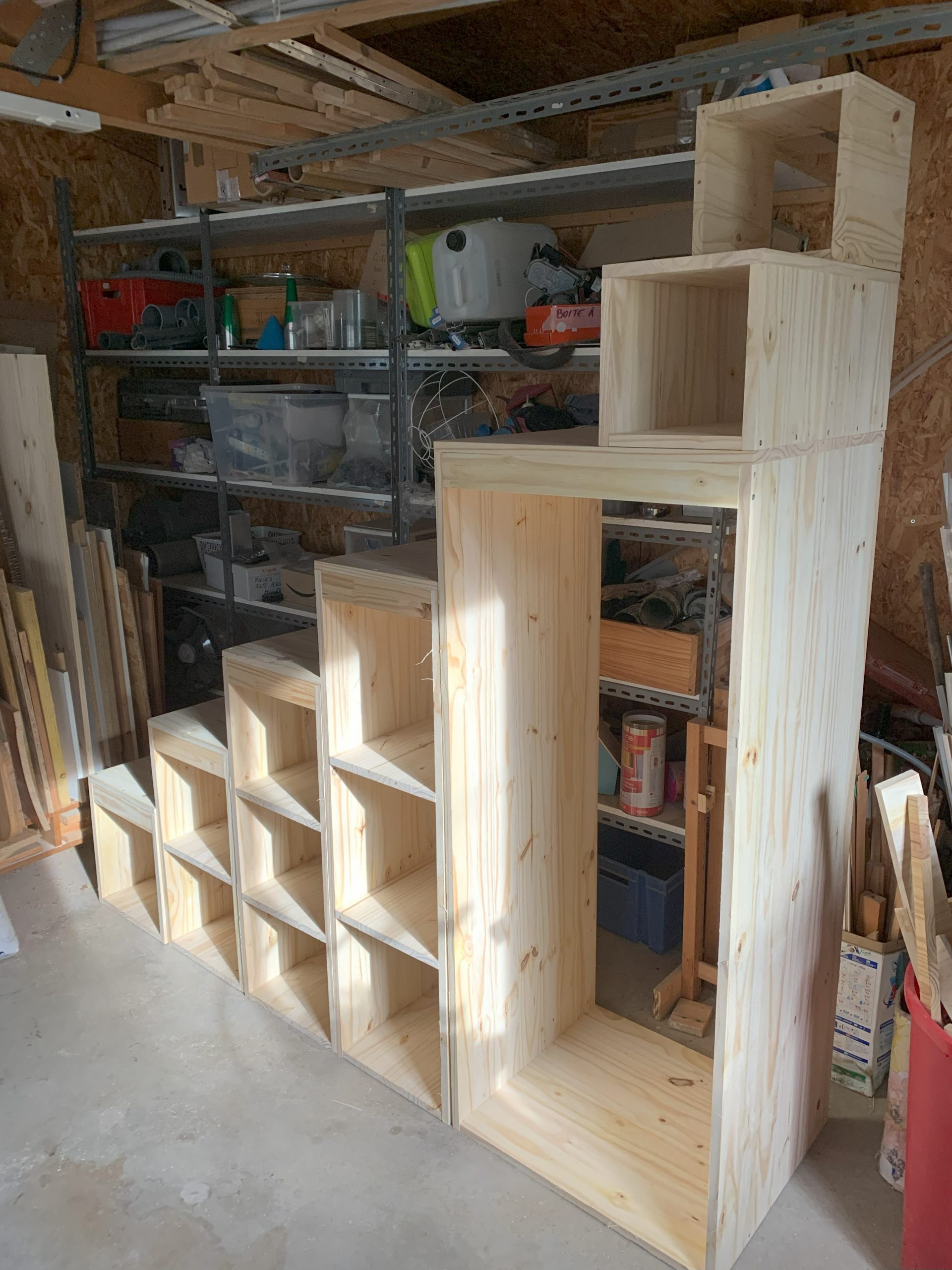 Il y a une seule chose que je n’avais pas anticipé, c’est l’épaisseur des plinthes, qui n’y étaient pas quand j’ai commencé la fabrication. Celà décolle les blocs des murs, mais ce n’est pas gênant, il faudra des équerres ou des cales pour assembler au mur. Et j’ai décalé le dernier bloc au contact du mur, celà ne fait pas trop bizarre.