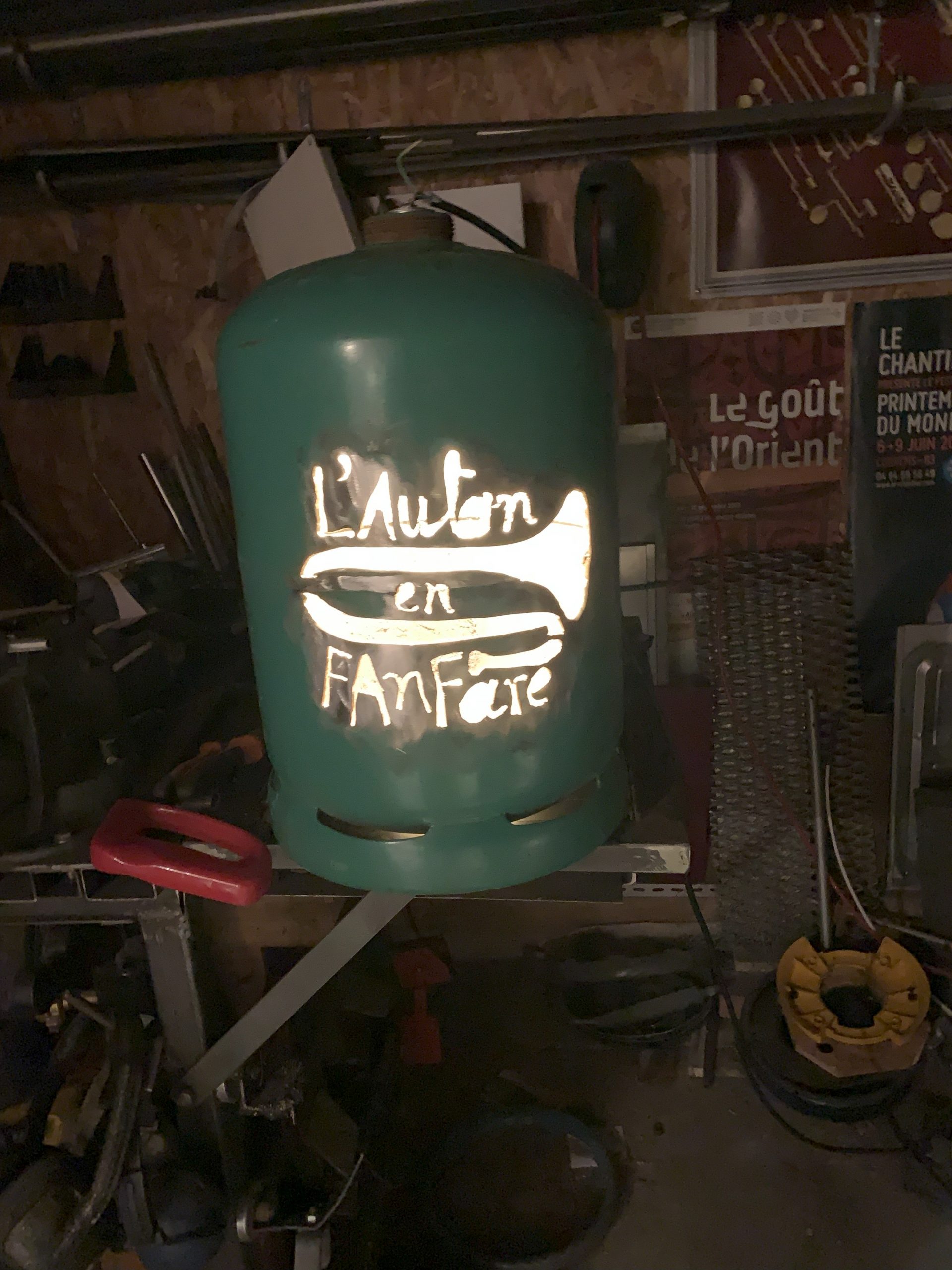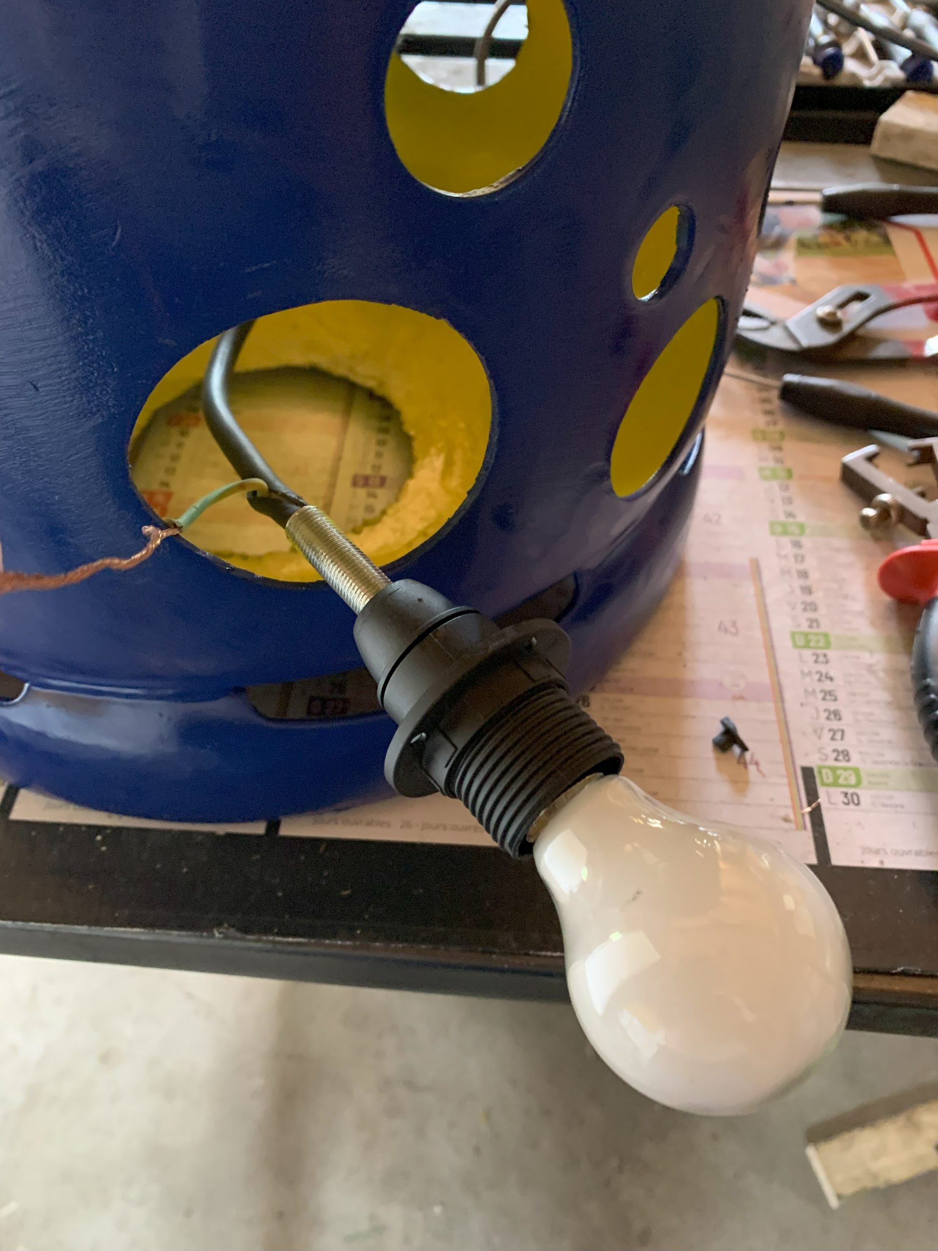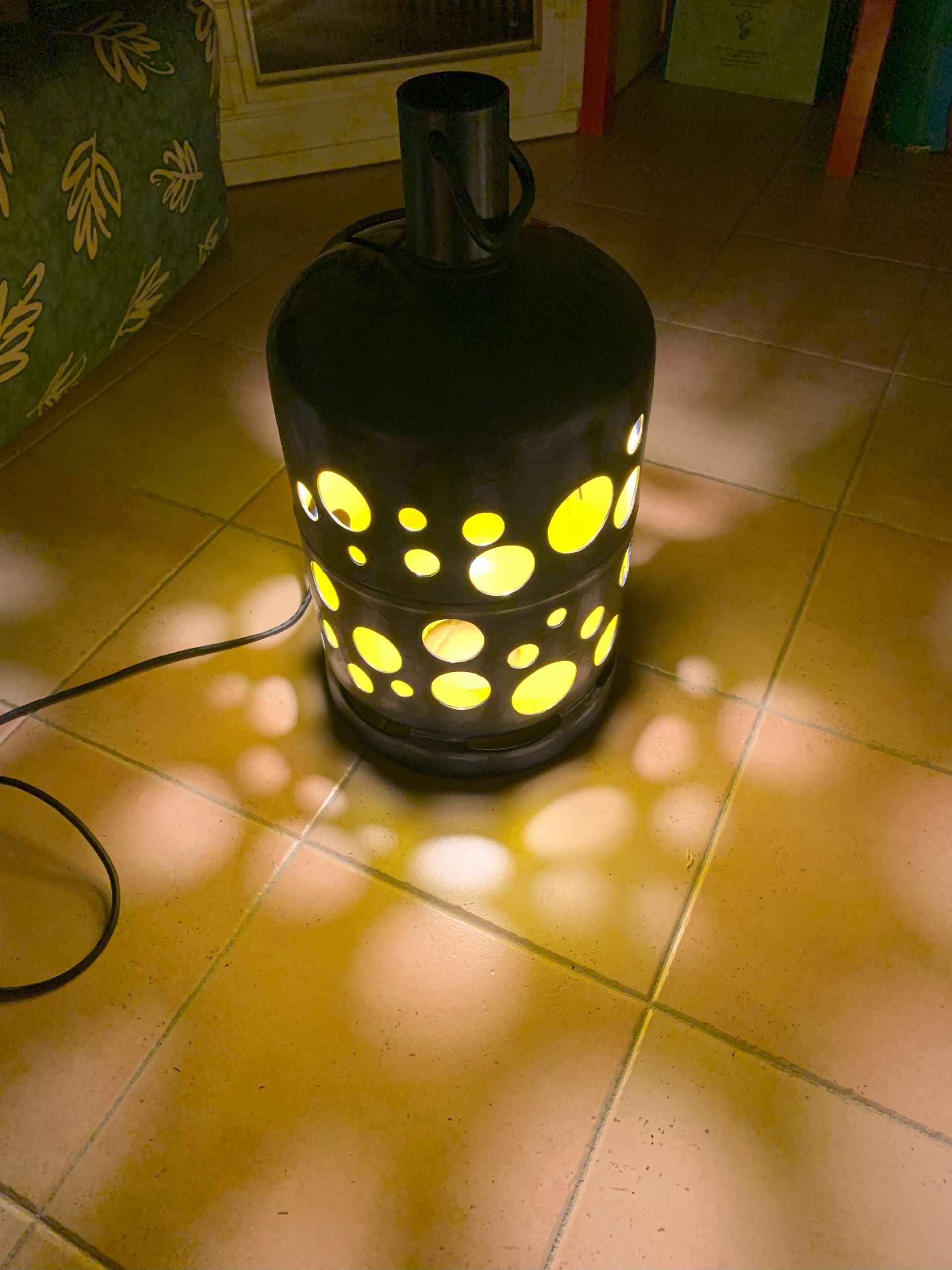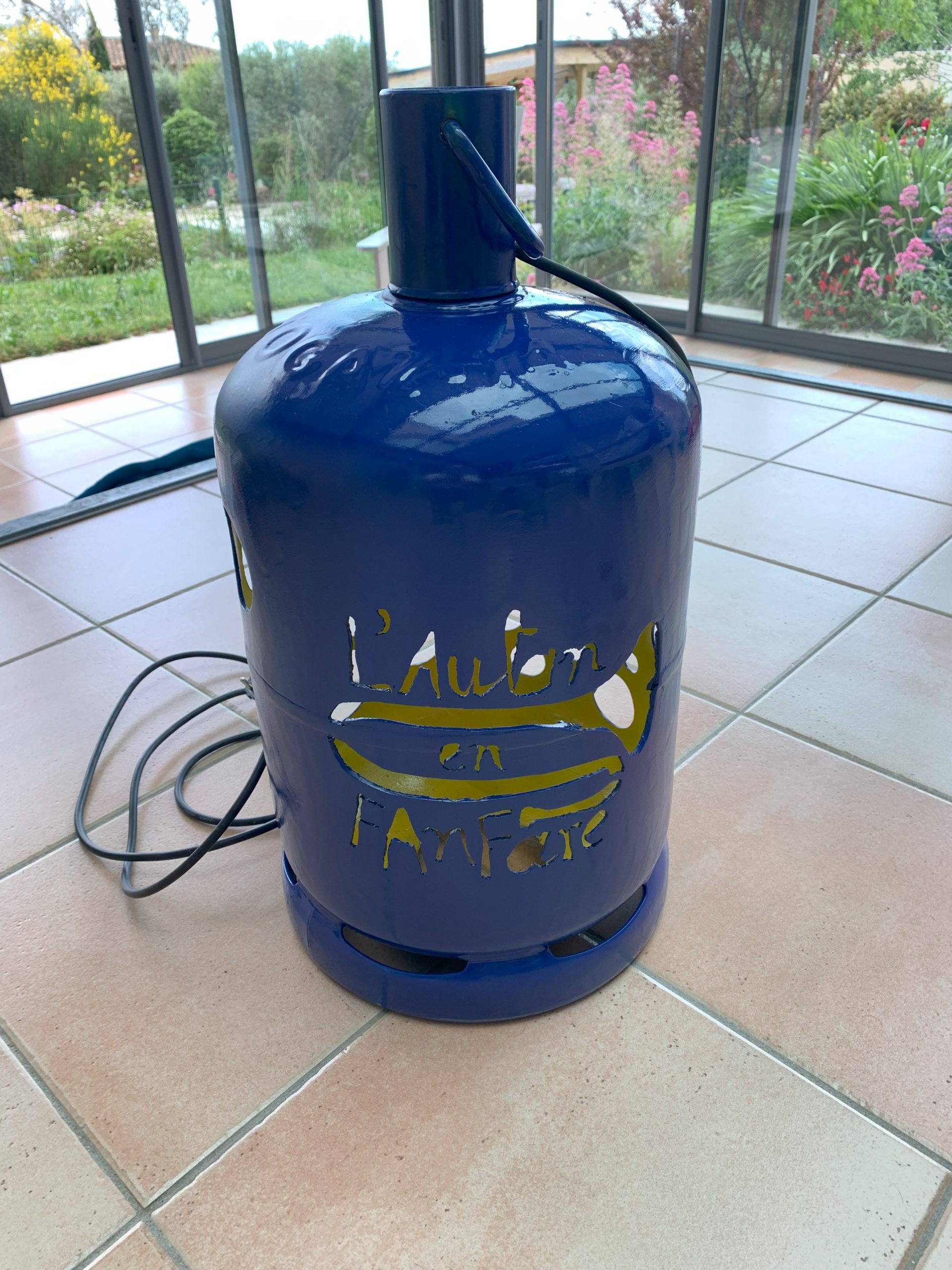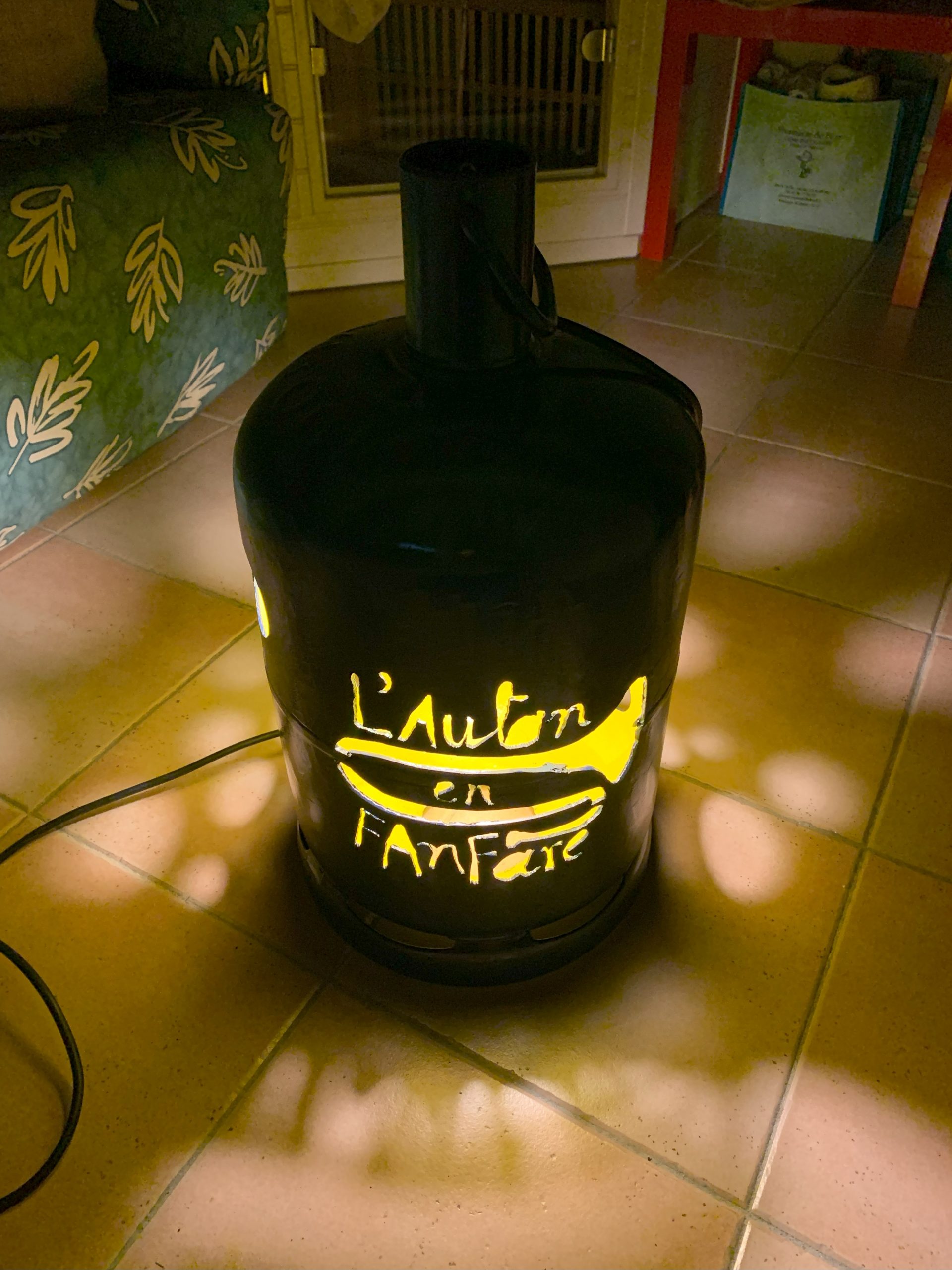 Pour remercier les organisateurs j’ai fabriqué une (autre ) lampe avec une bouteille de gaz en reproduisant leur logo.