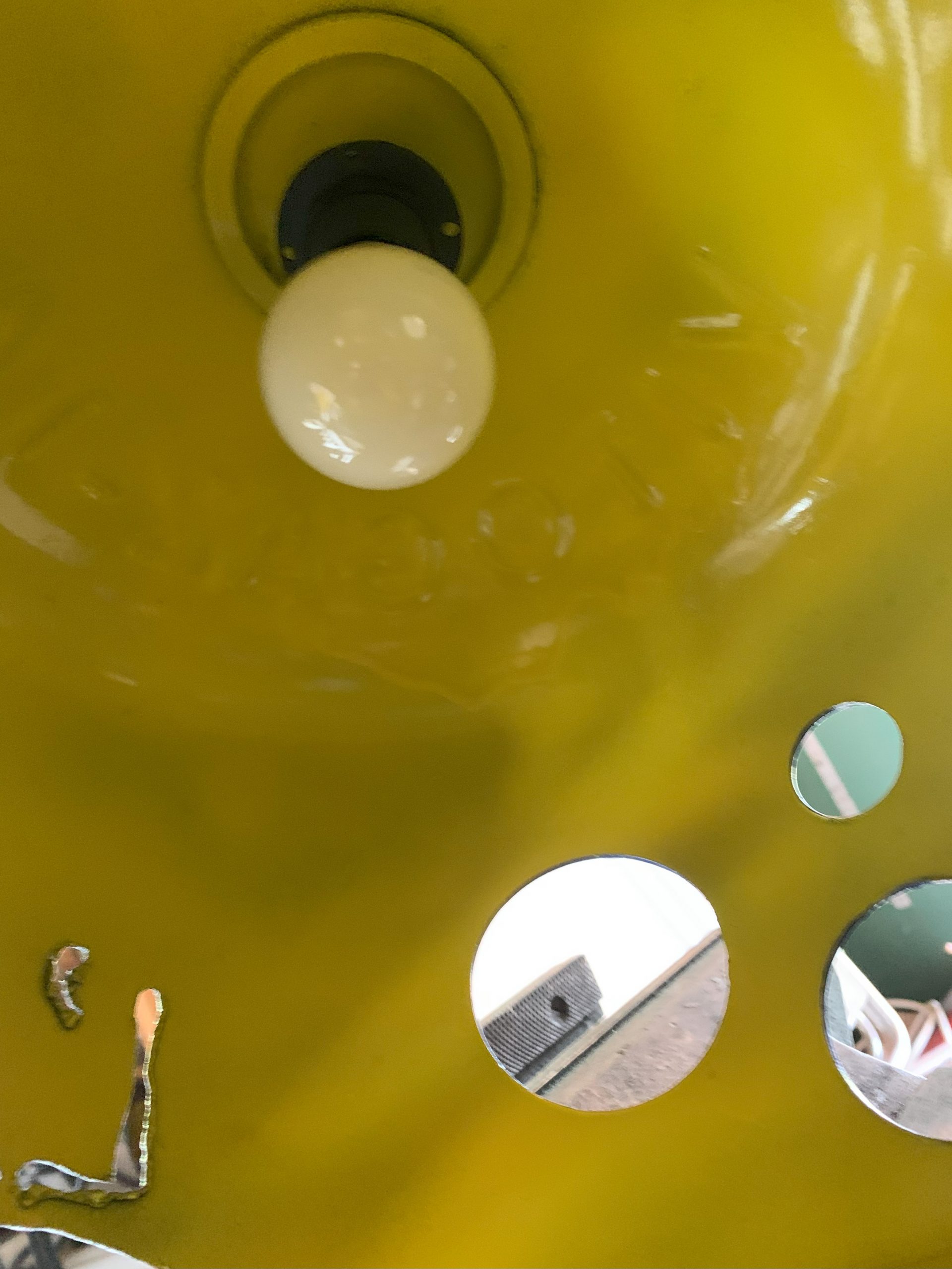 J’ai bien dégraissé la bouteille puis j’ai peint l’intérieur en jaune par le trou inférieur.