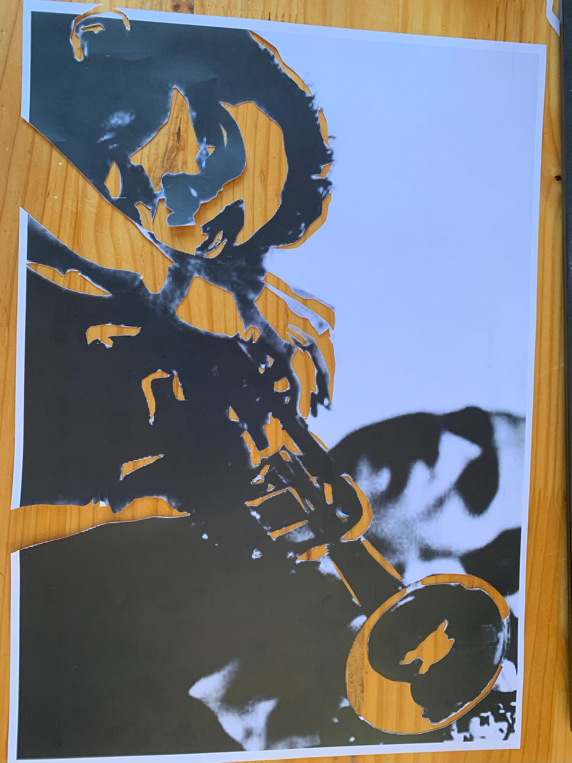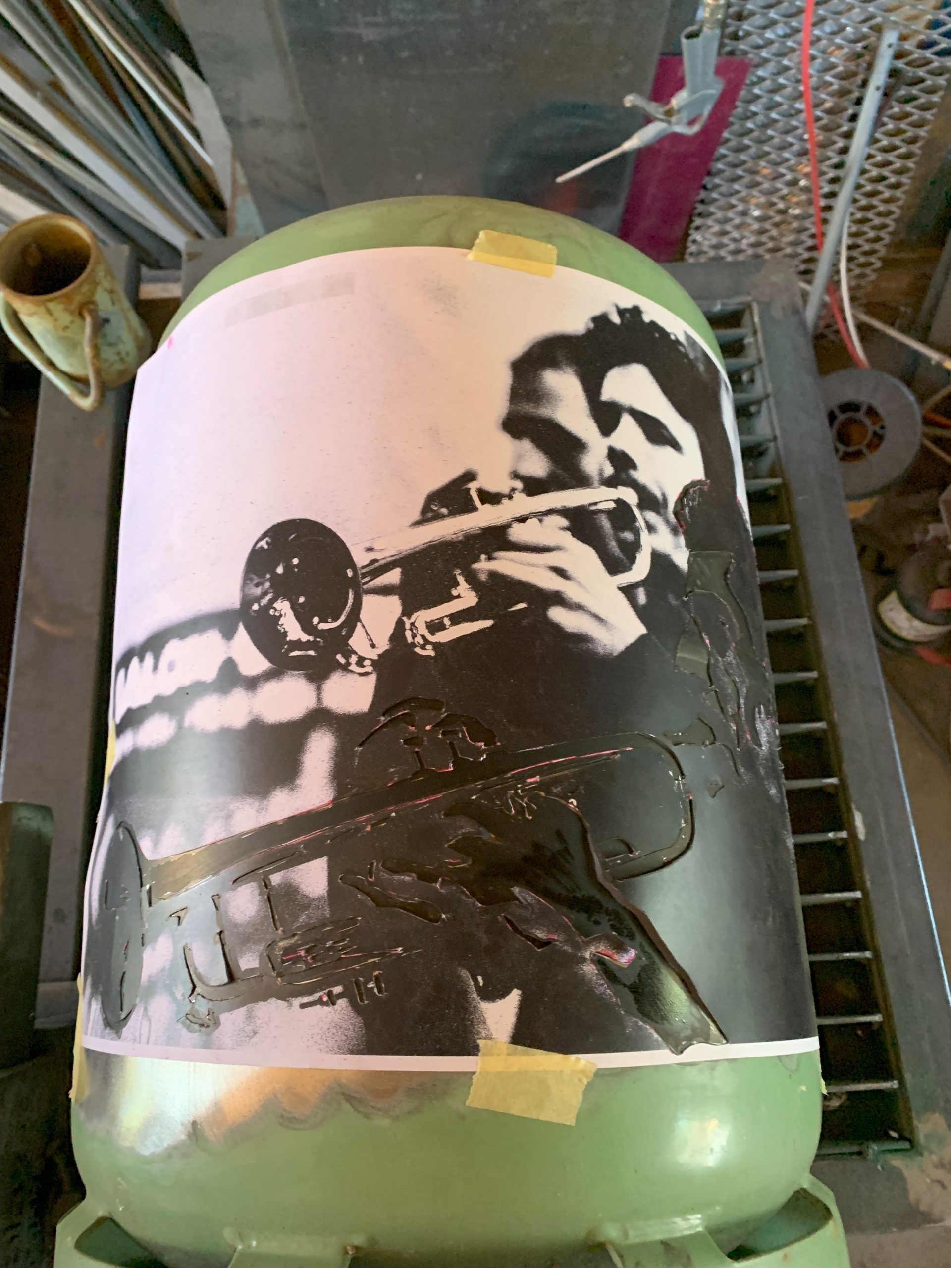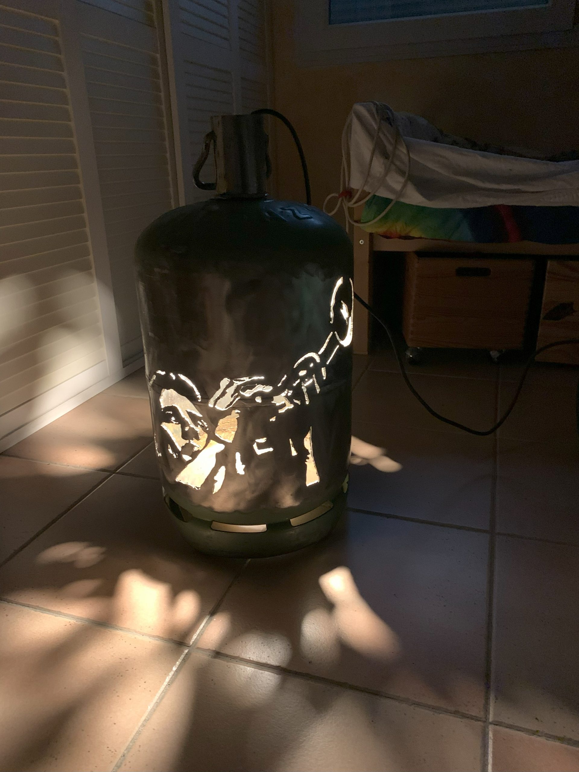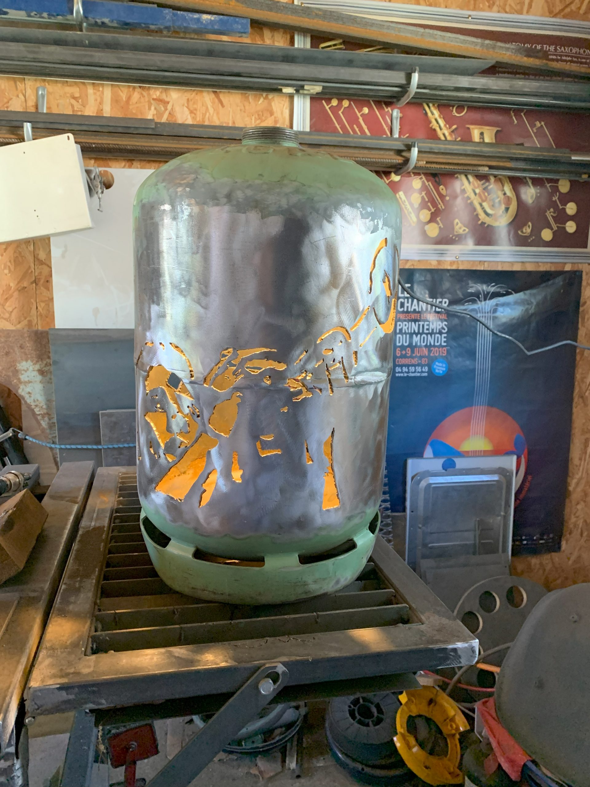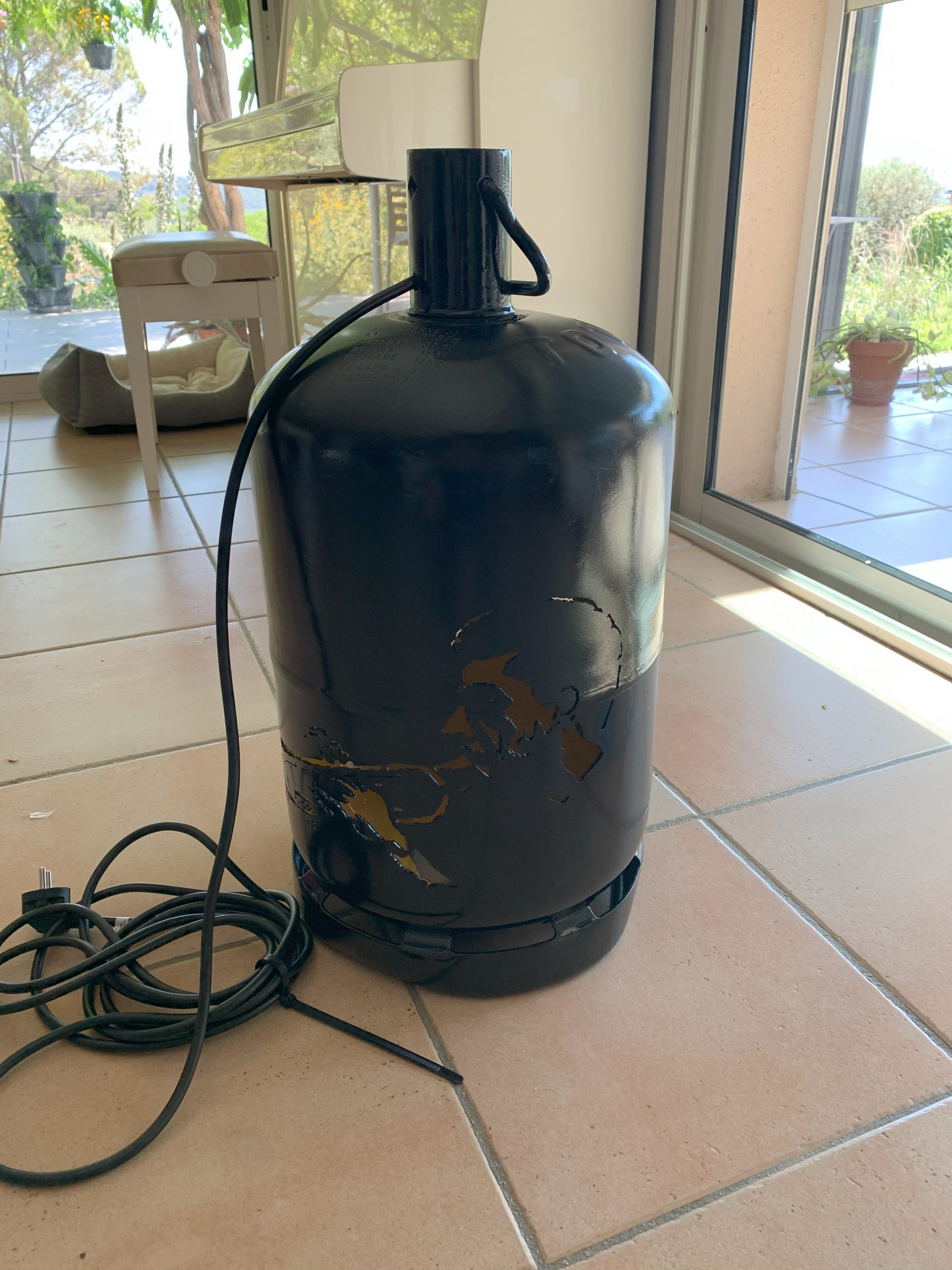 J’ai déja fait un certain nombre de lampes avec des bouteilles de gaz, mais pour l’anniversaire de Nico qui joue de la trompette à la fanfare, je me suis lancé dans une lampe plus élaborée à partir de deux belles photos Noir et Blanc.