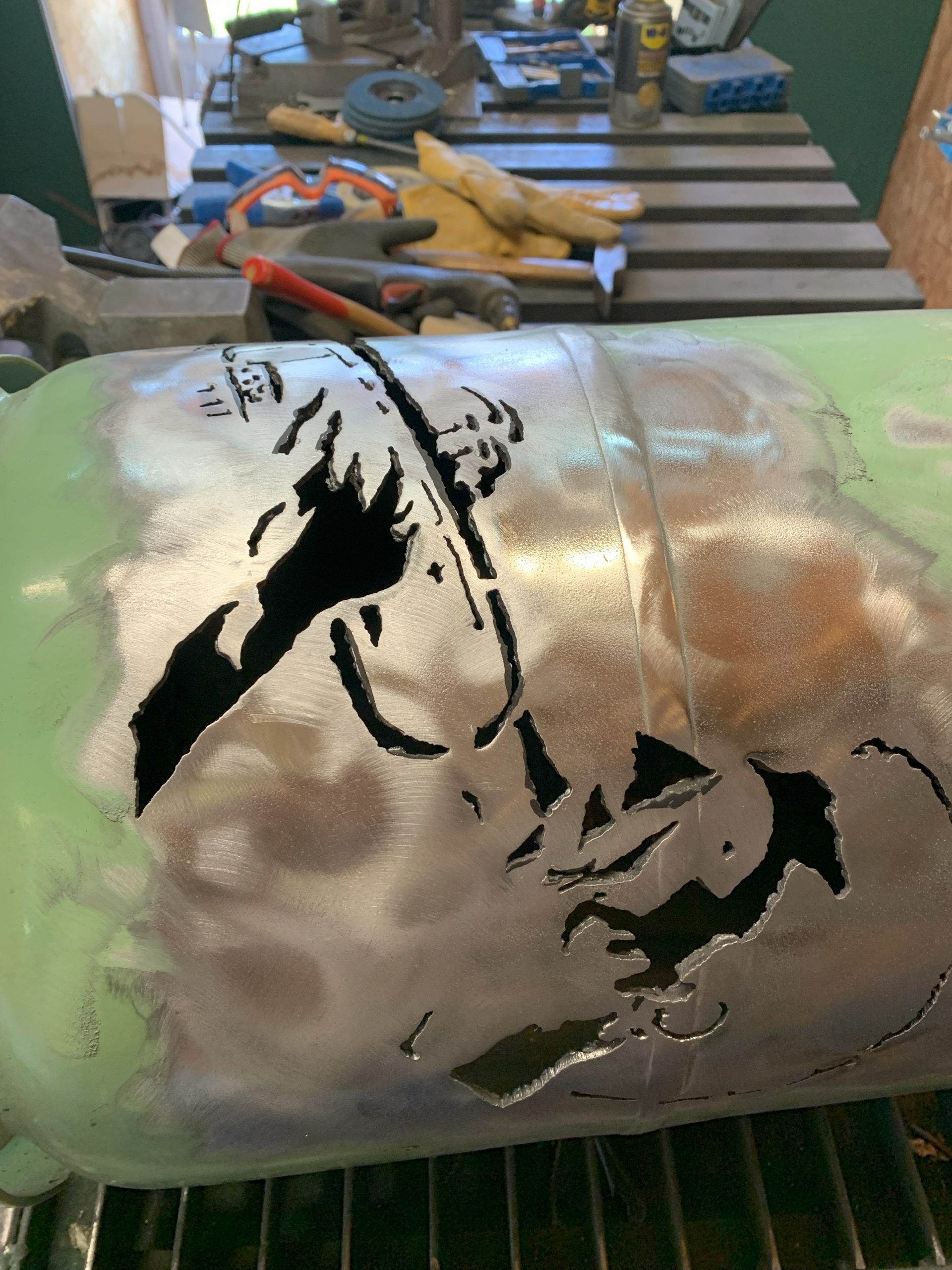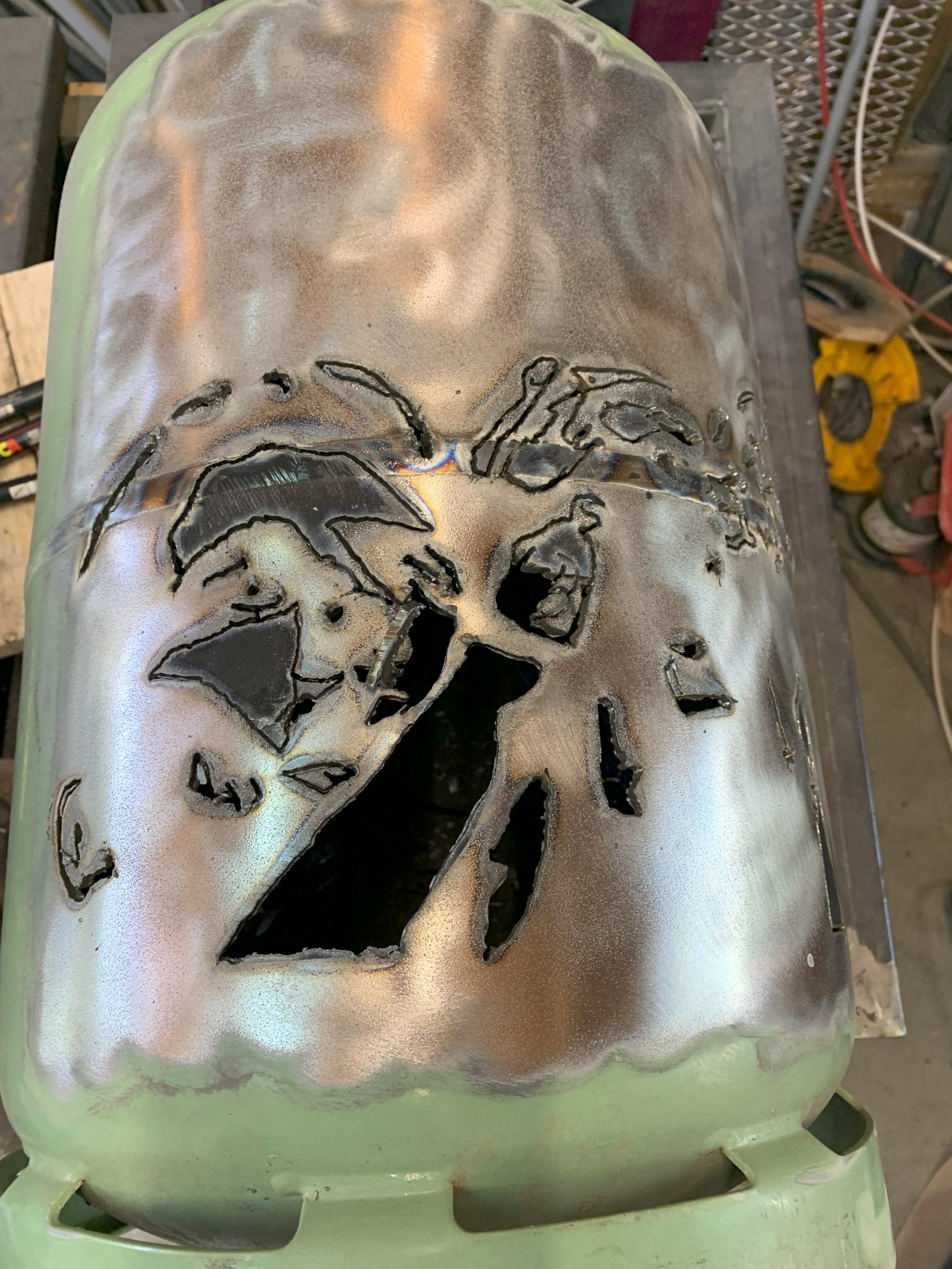 Pour découper des formes aussi complexes, mon seul choix était la découpe plasma, mais la difficulté que je rencontre est qu’il est difficile de suivre le tracé car avec les lunettes de protection on n’y voit pas clair (c’est un peu le but de filtrer la lumière…) et aussi la peinture brûle et le tracé disparait.
