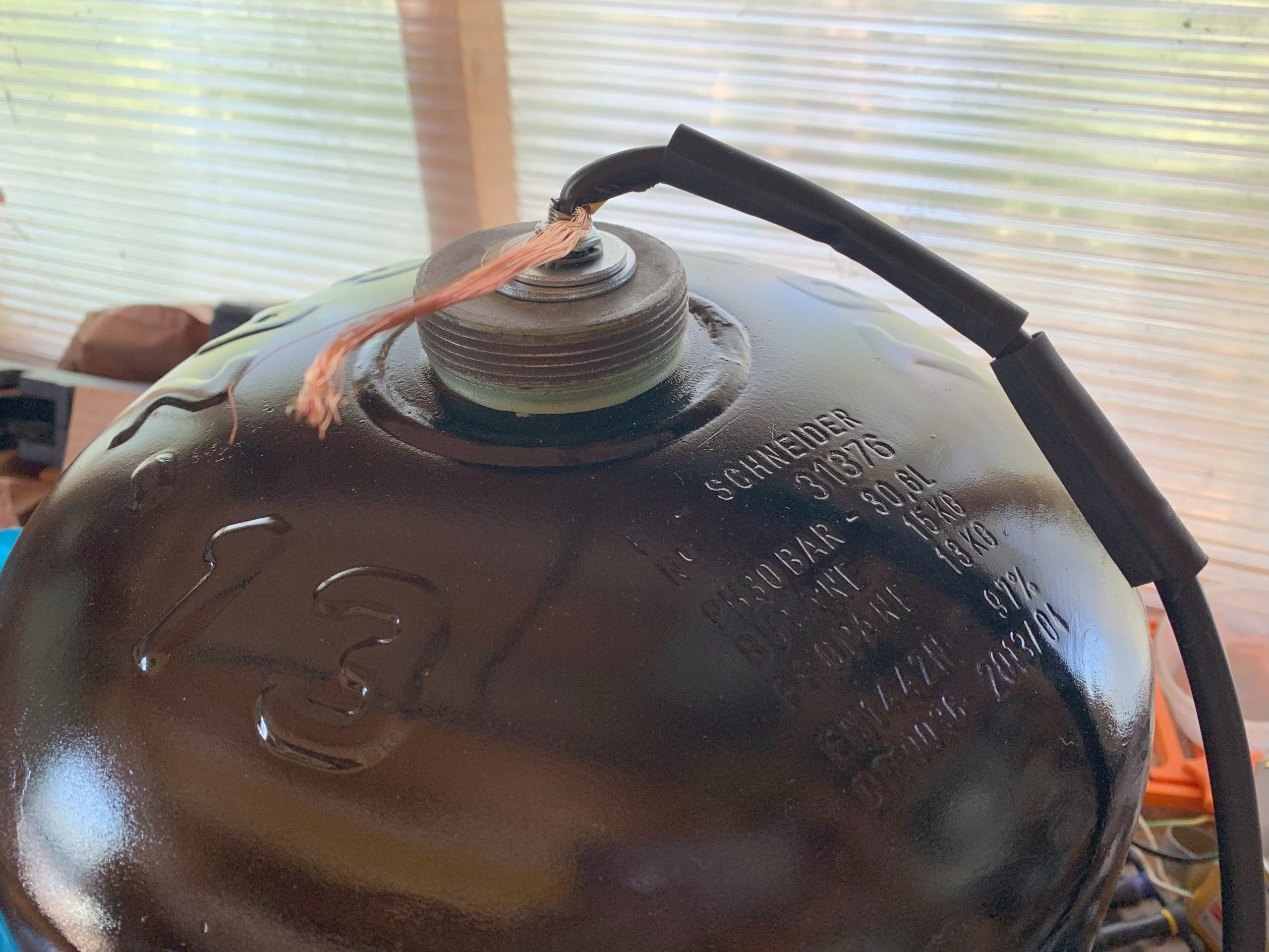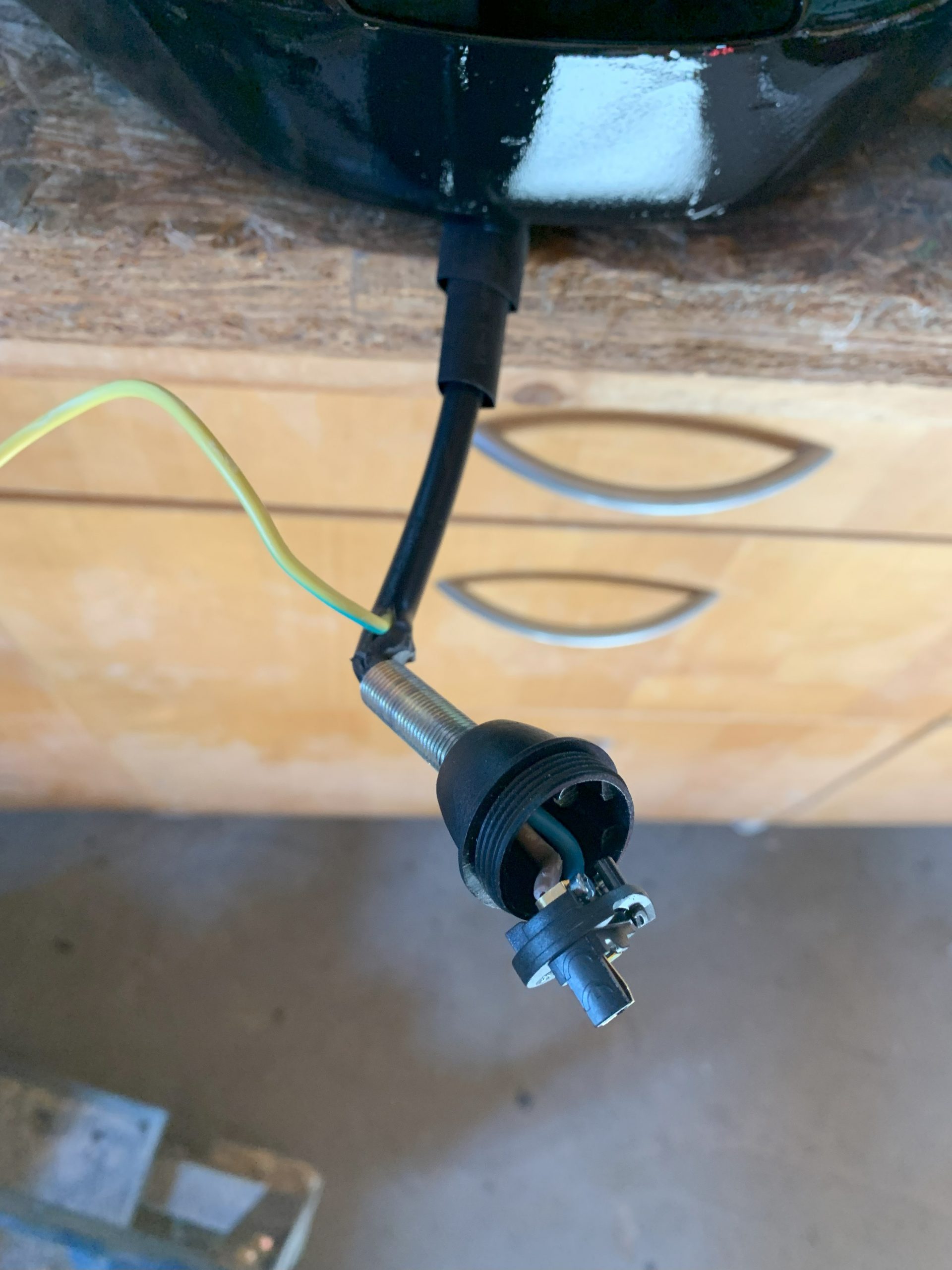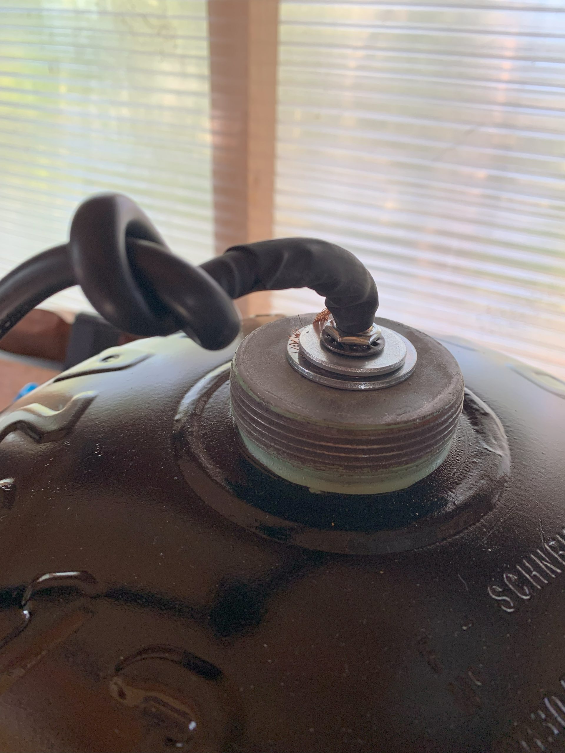 Puis j’ai monté la douille sur le cable électrique, par le trou du dessous de la bouteille. Il y a un certain ordre à respecter: douille, partie inférieure de la douille, tube de fixation, par l’intérieur de la bouteille, et coté extérieur, rondelle large, rondelle moins large (la mise à la terre se fait grace aux rondelles), écrou, gaine thermo rétratable, et enfin poignée de la bouteille de gaz.