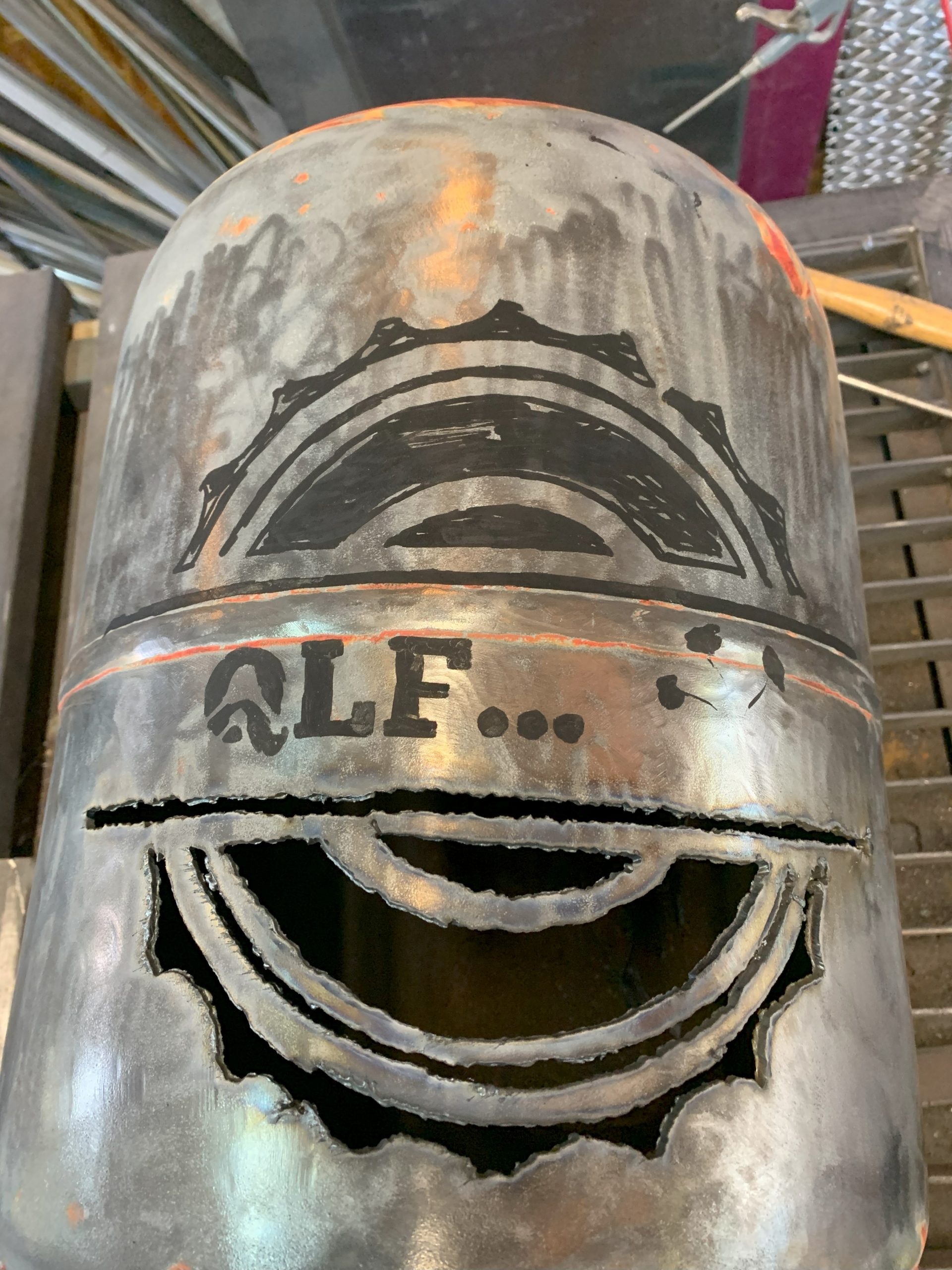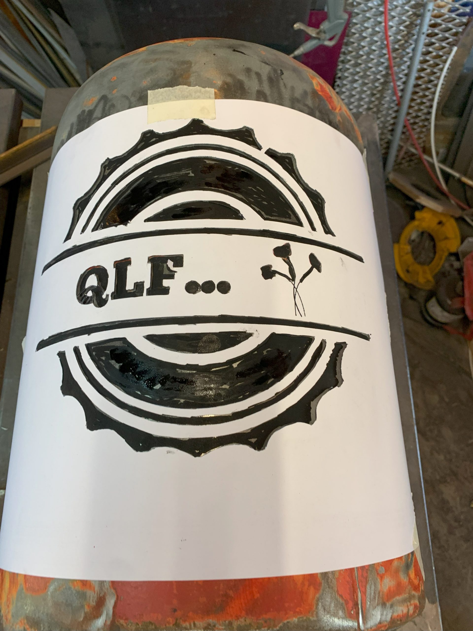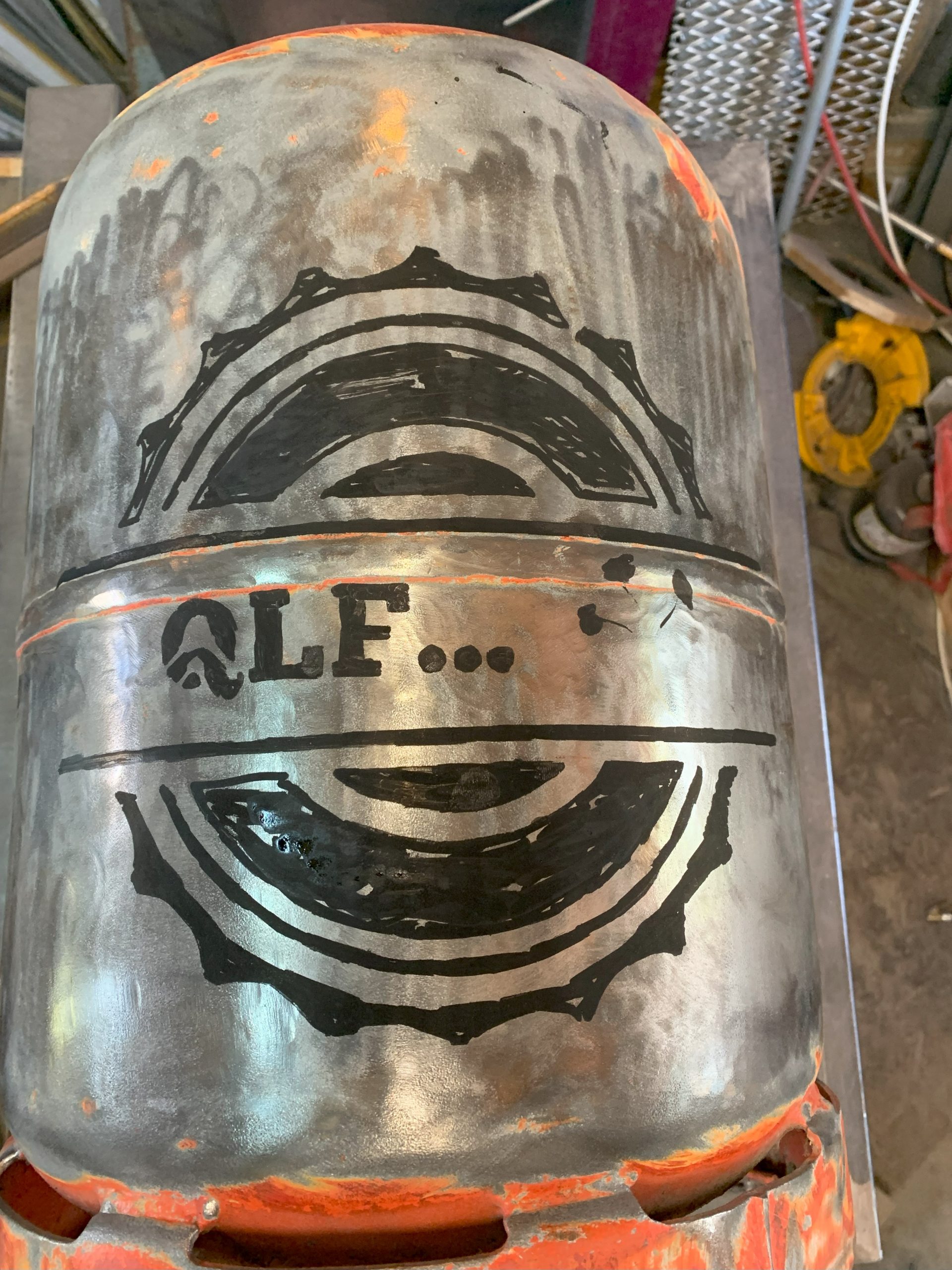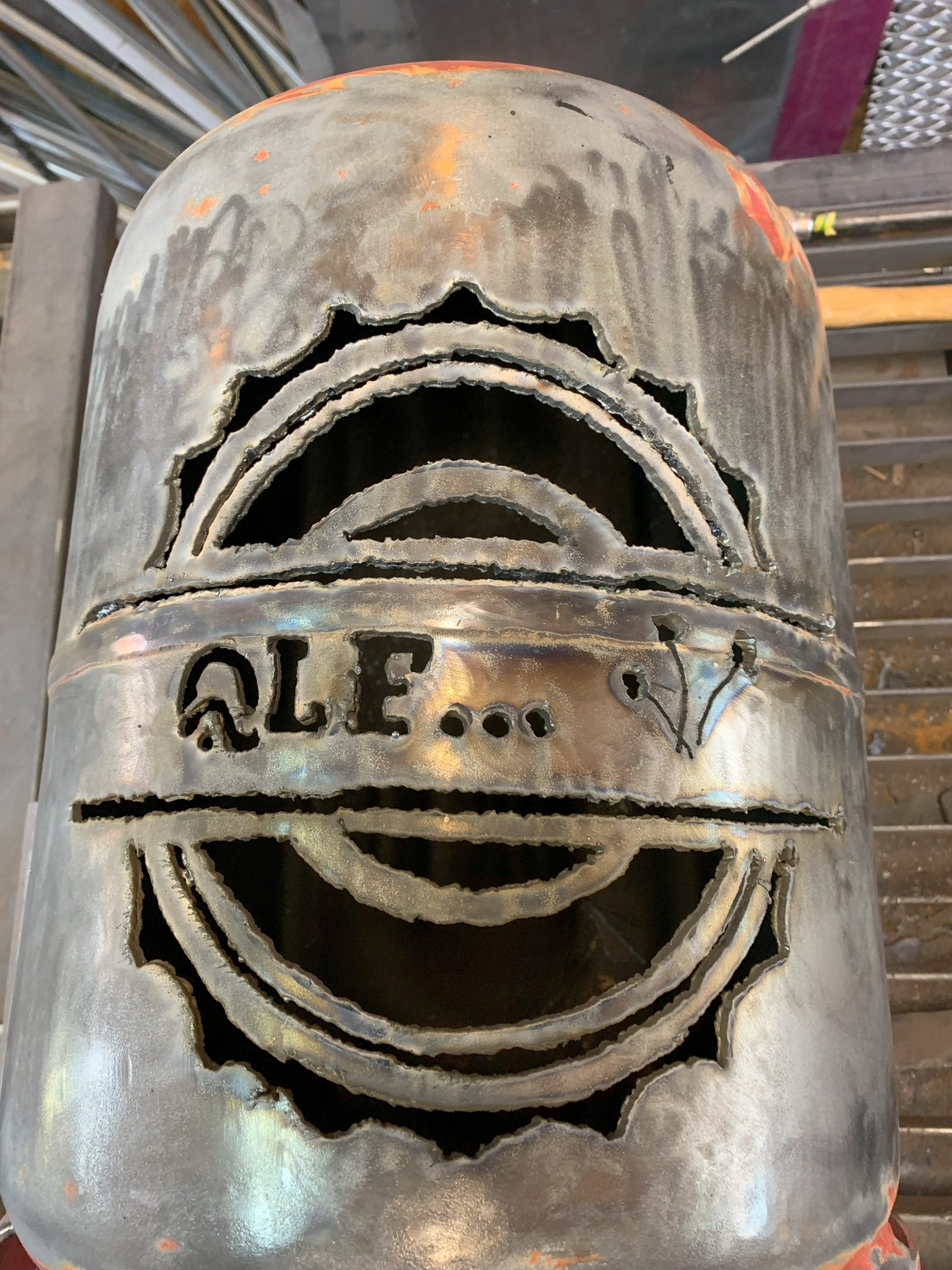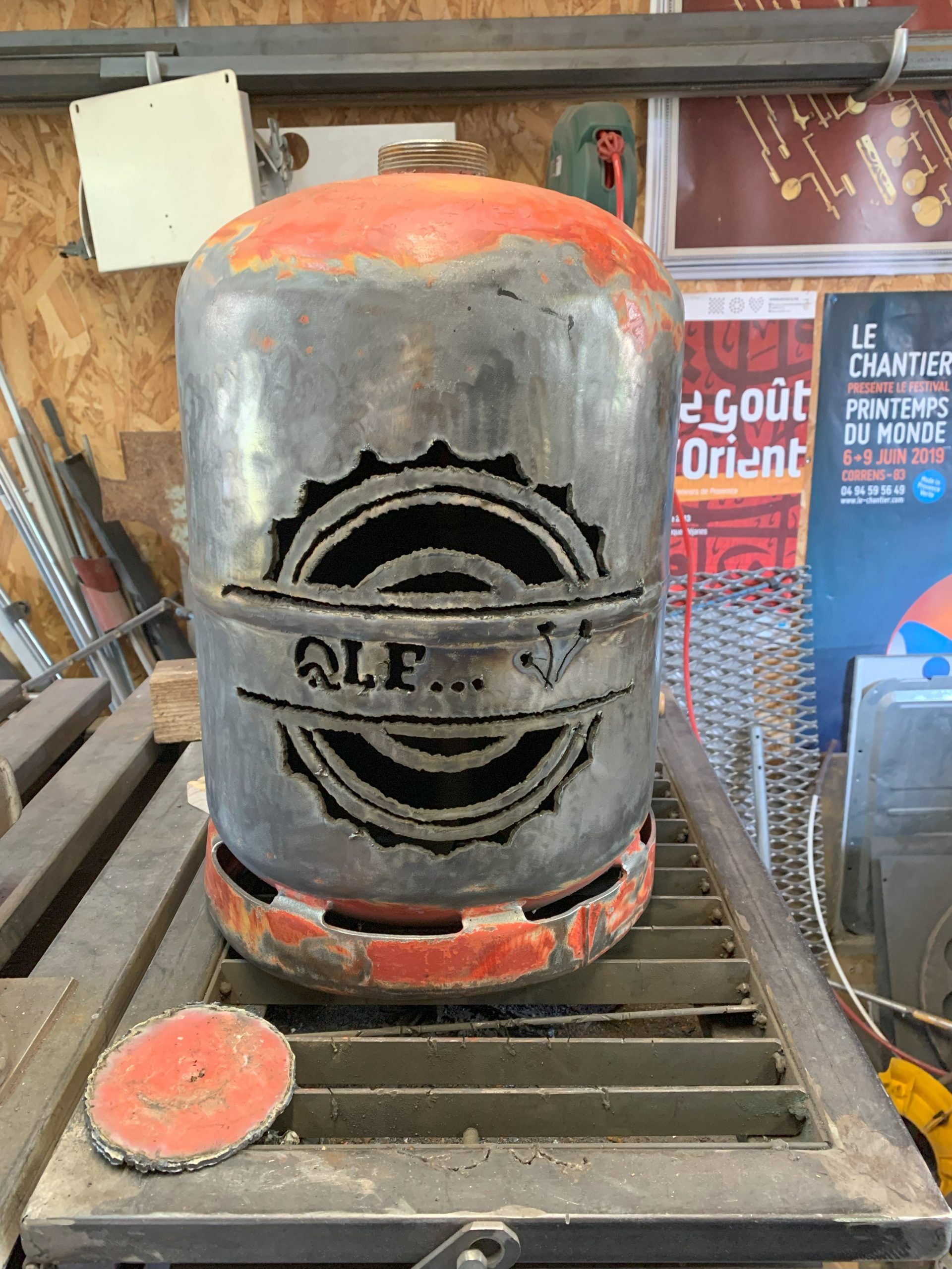 Toujours la même méthode pour fabriquer: imprimer le logo, le découper, le reporter sur la bouteille de gaz (vide bien sur, allez voir dans les autres articles comment je fais pour la vider), puis découper avec la torche au plasma en suivant le tracé du mieux que je peux.