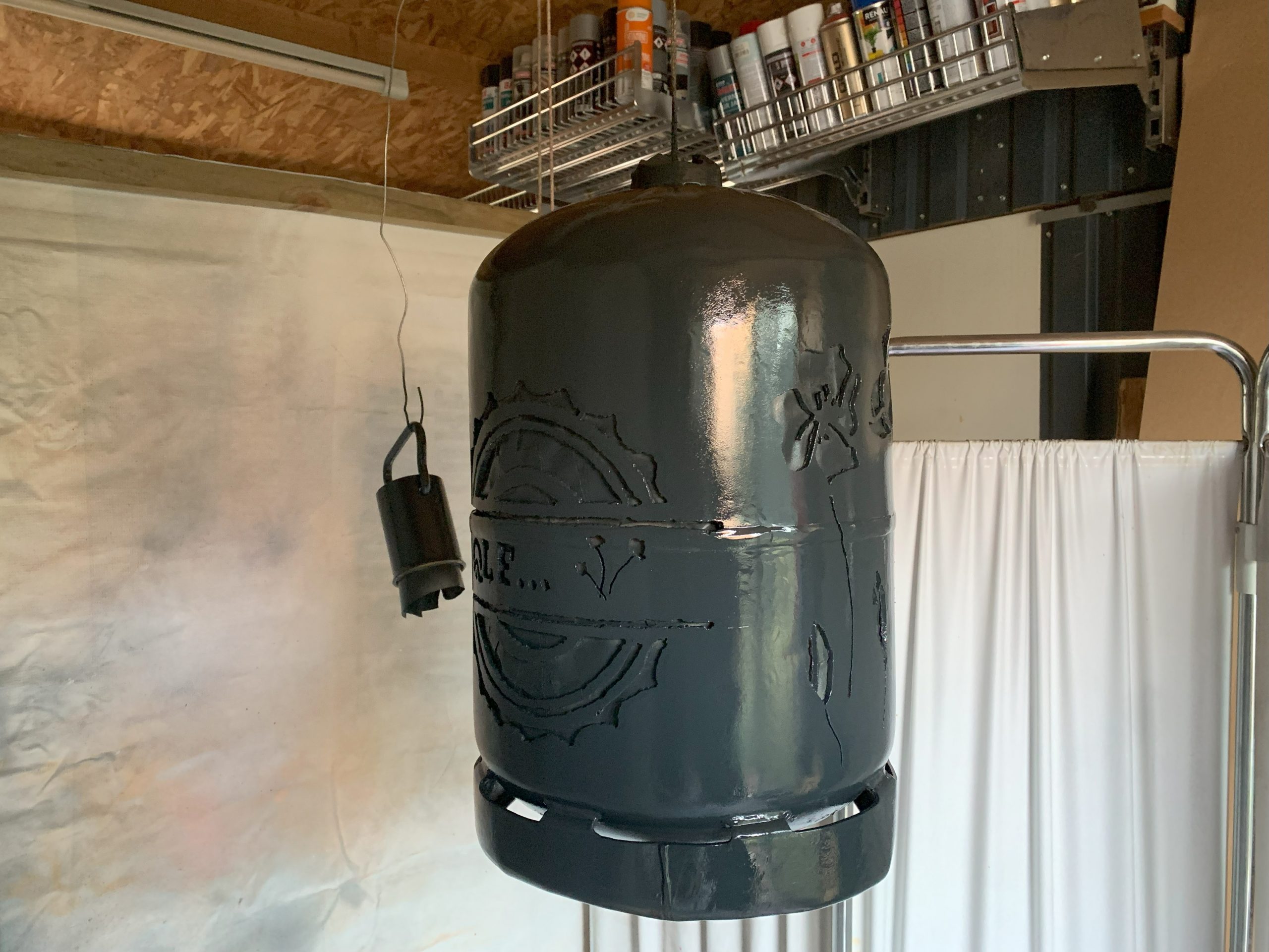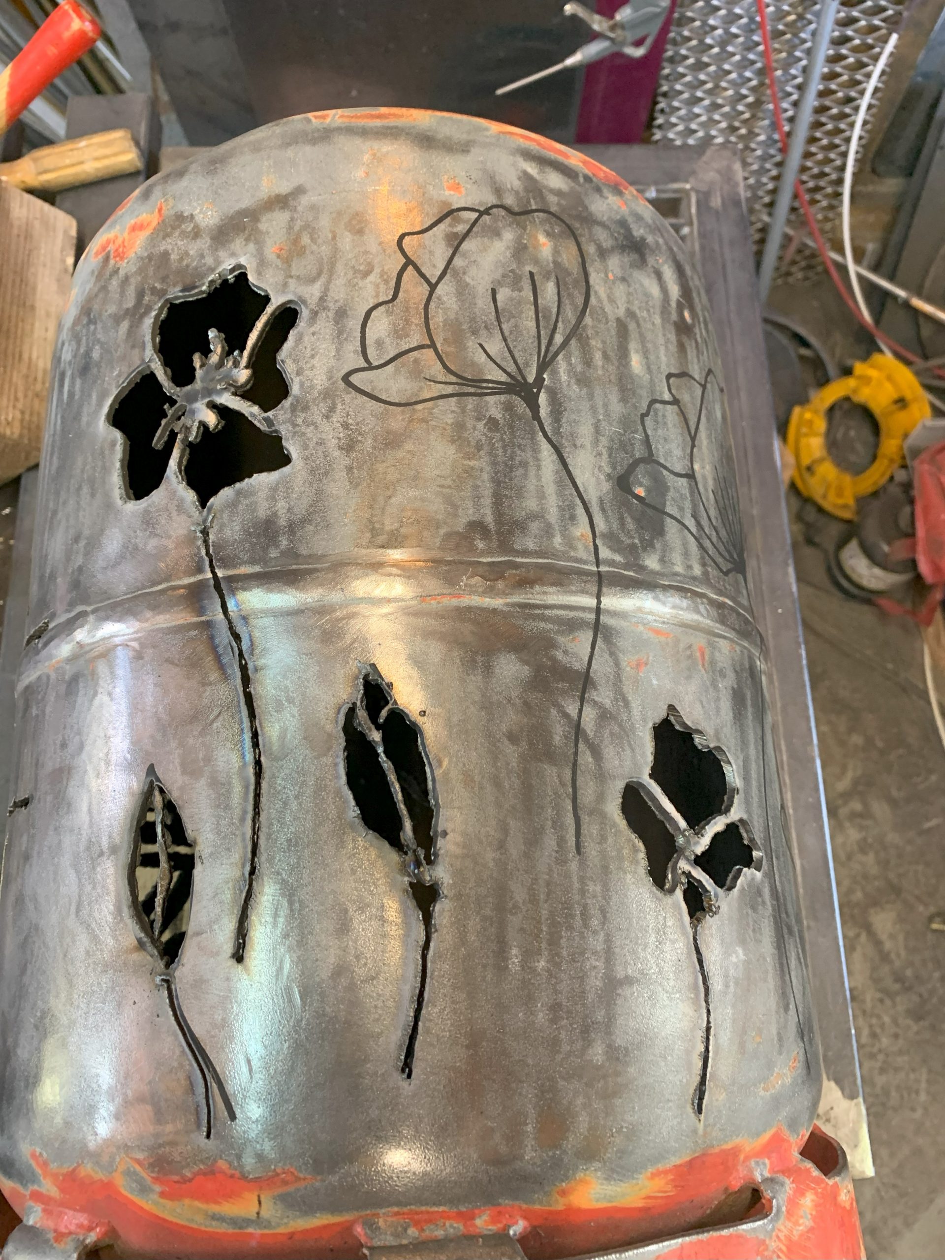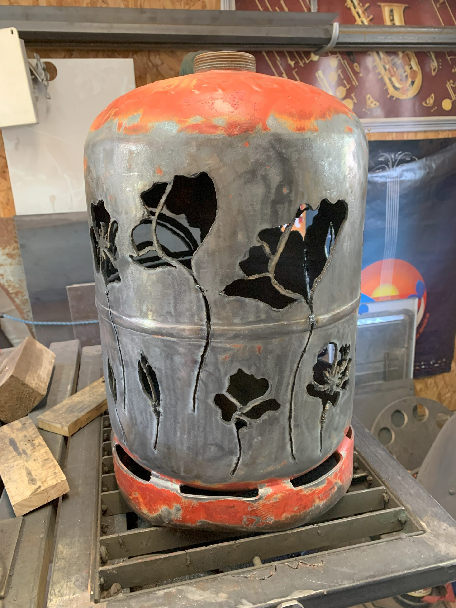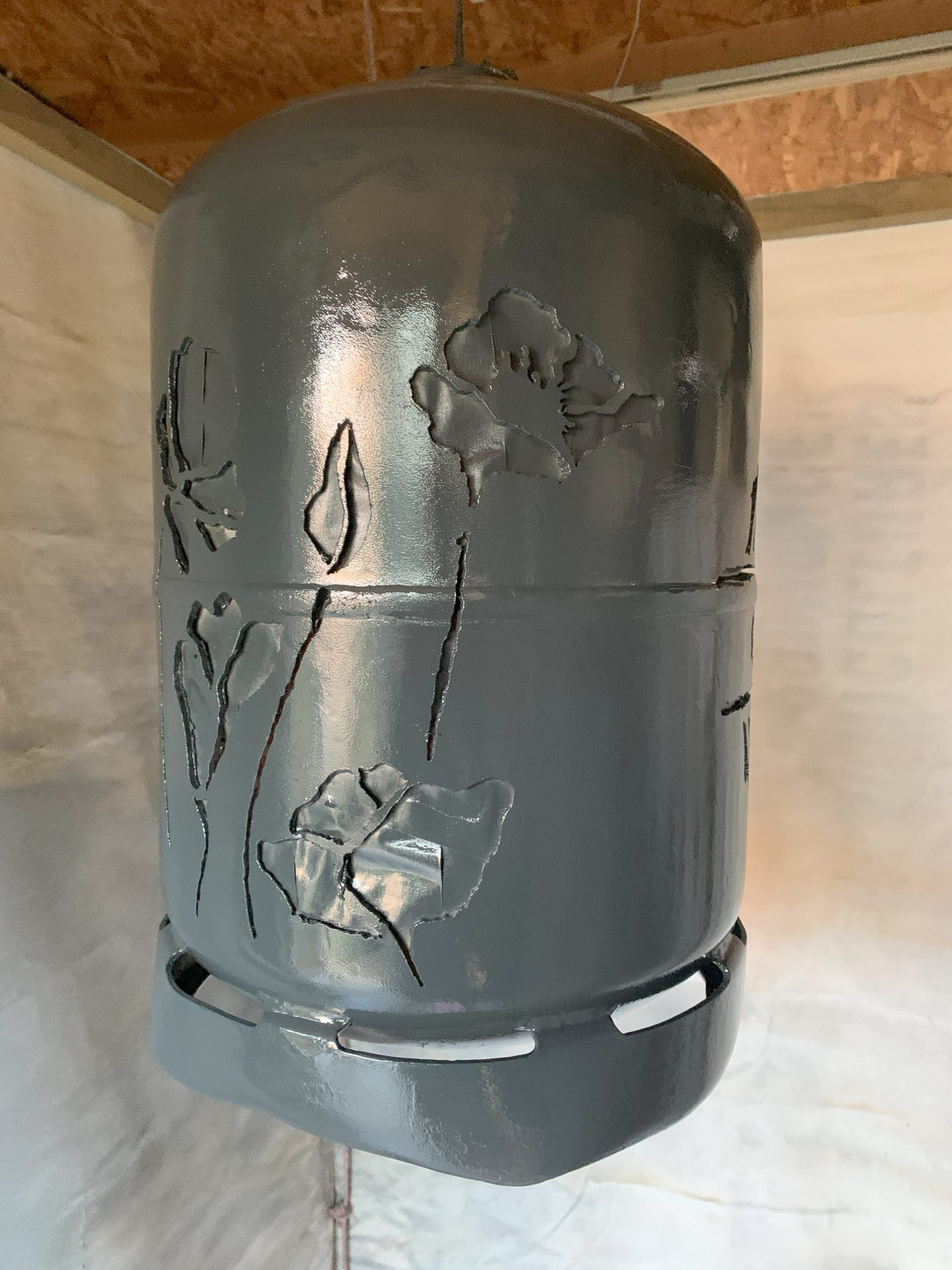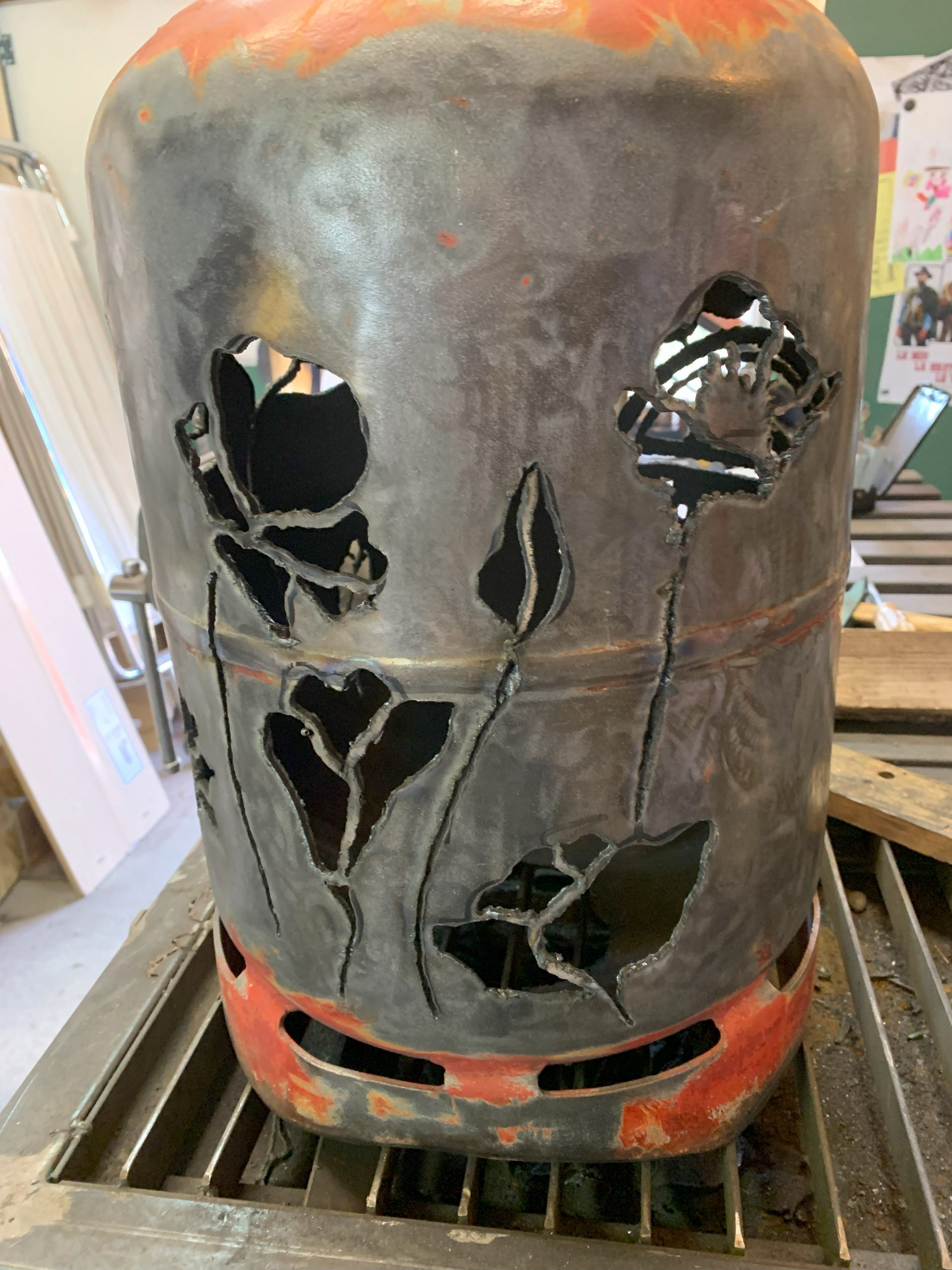 Toujours la même méthode pour fabriquer: imprimer le logo, le découper, le reporter sur la bouteille de gaz (vide bien sur, allez voir dans les autres articles comment je fais pour la vider), puis découper avec la torche au plasma en suivant le tracé du mieux que je peux.