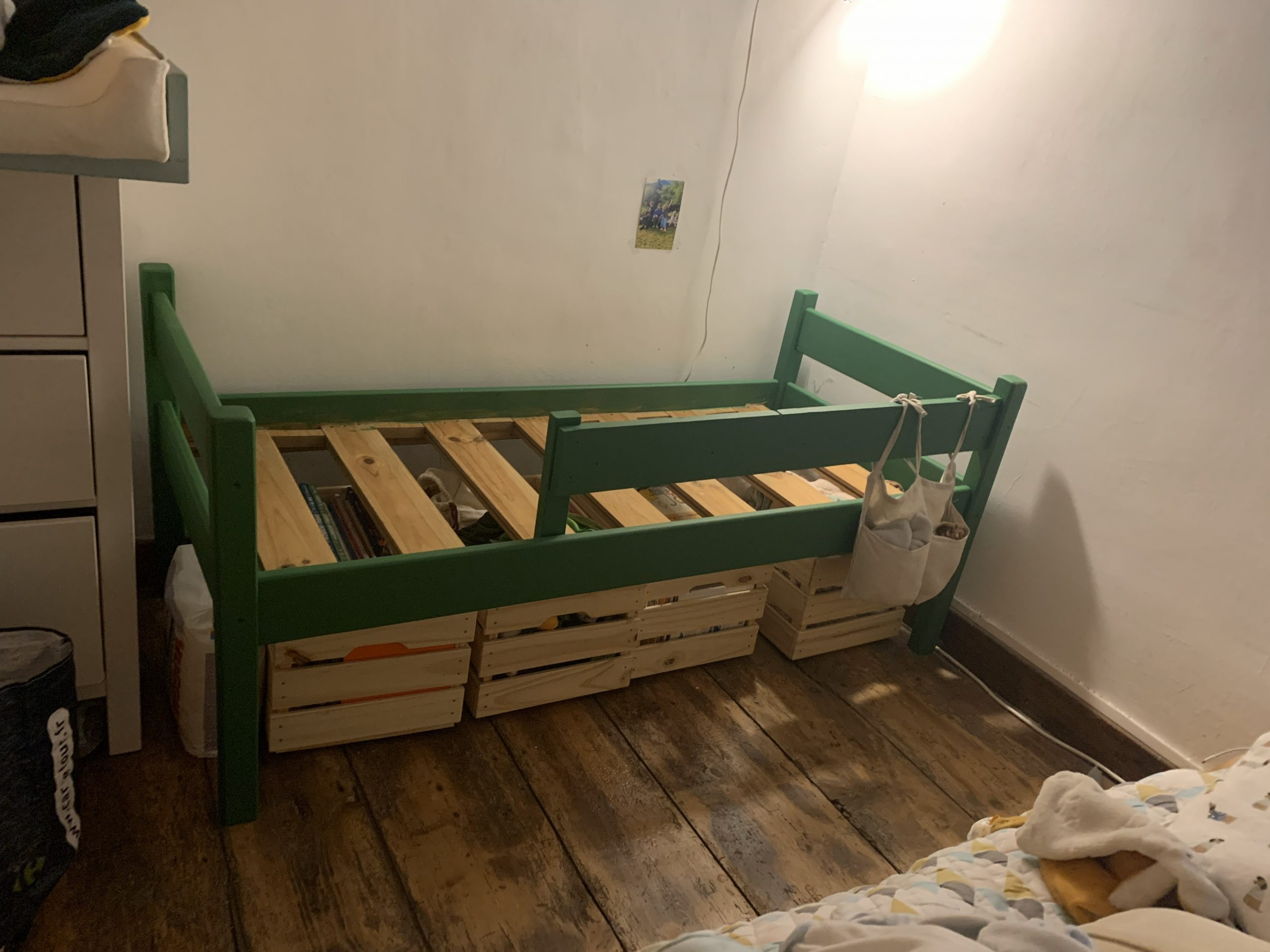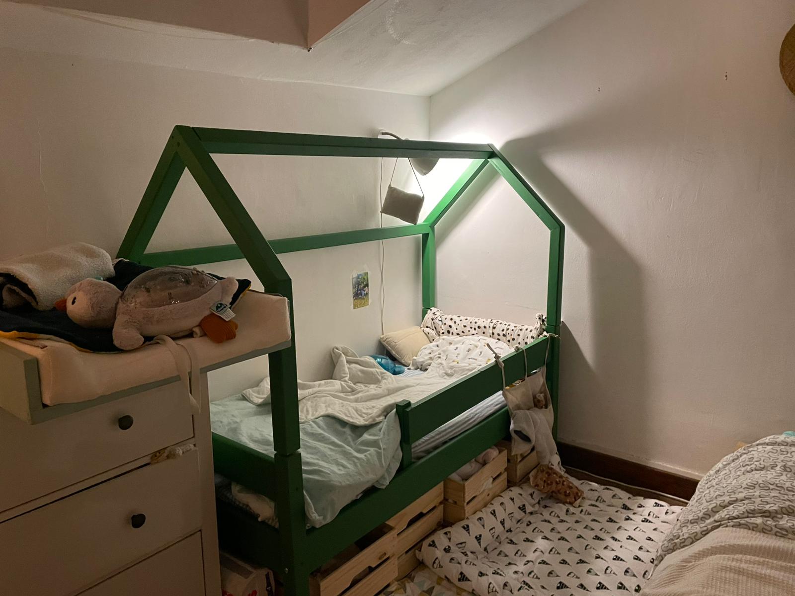 Milo a récupéré le petit lit que j’avais fabriqué pour les filles, il est adapté à une petite chambre et un petit enfant.