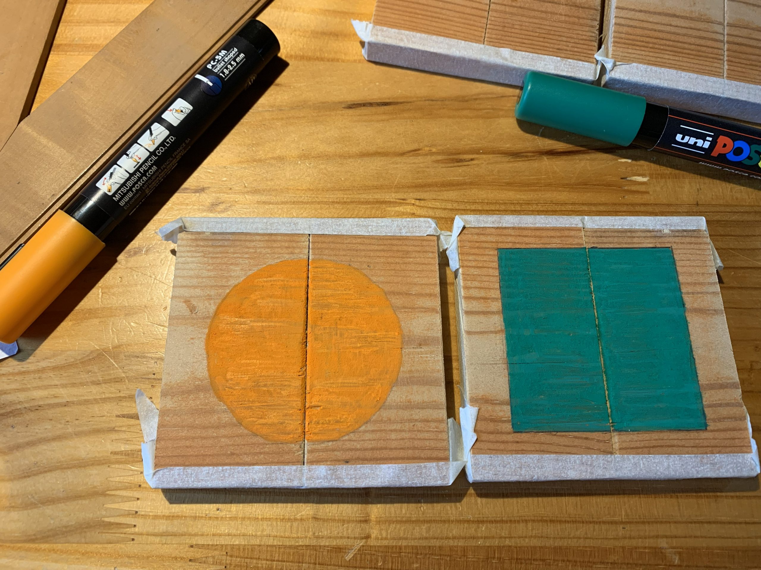 Pour dessiner les motifs, j’ai d’abord assemblé les 2 moitiés avec du scotch.