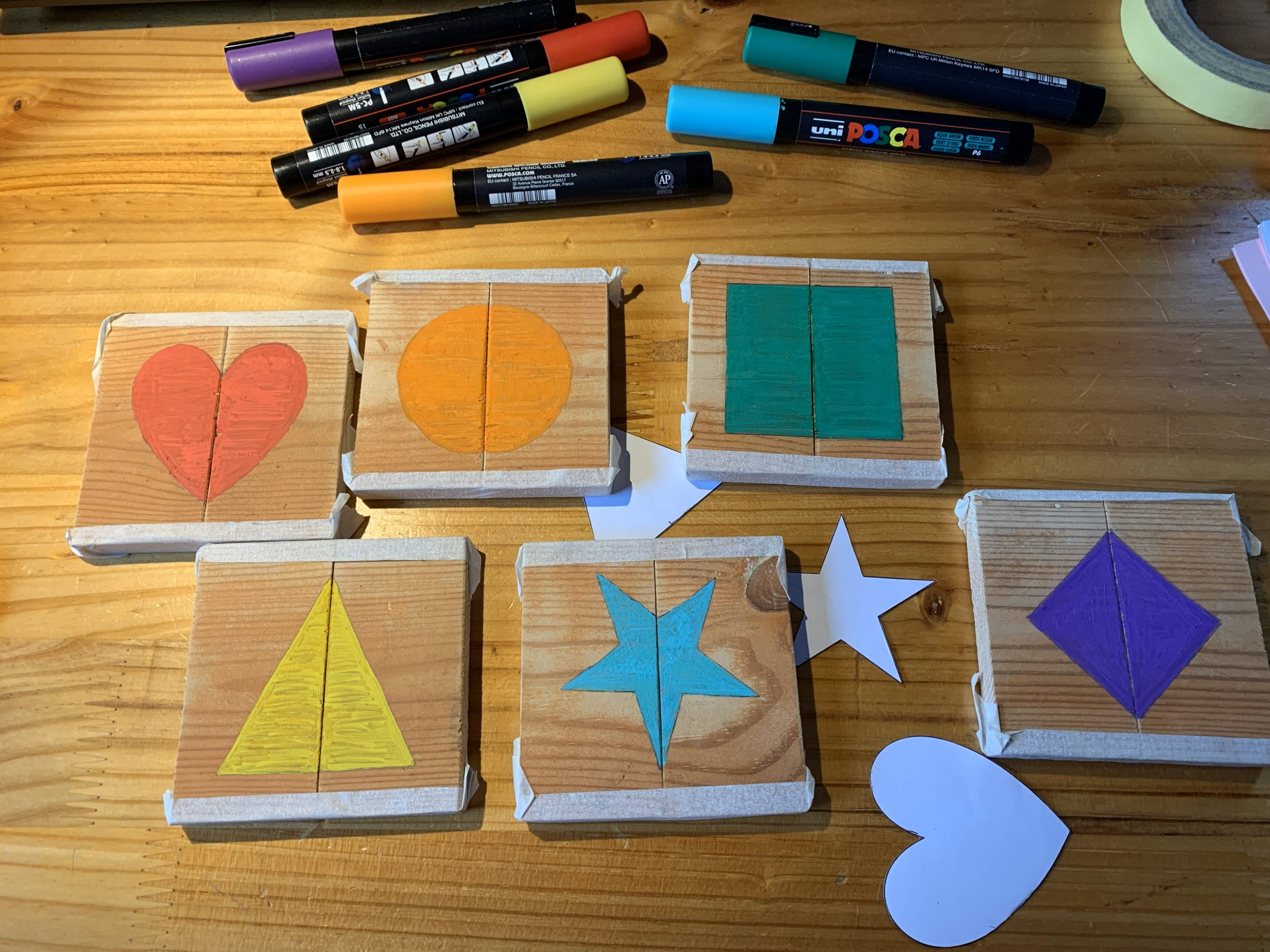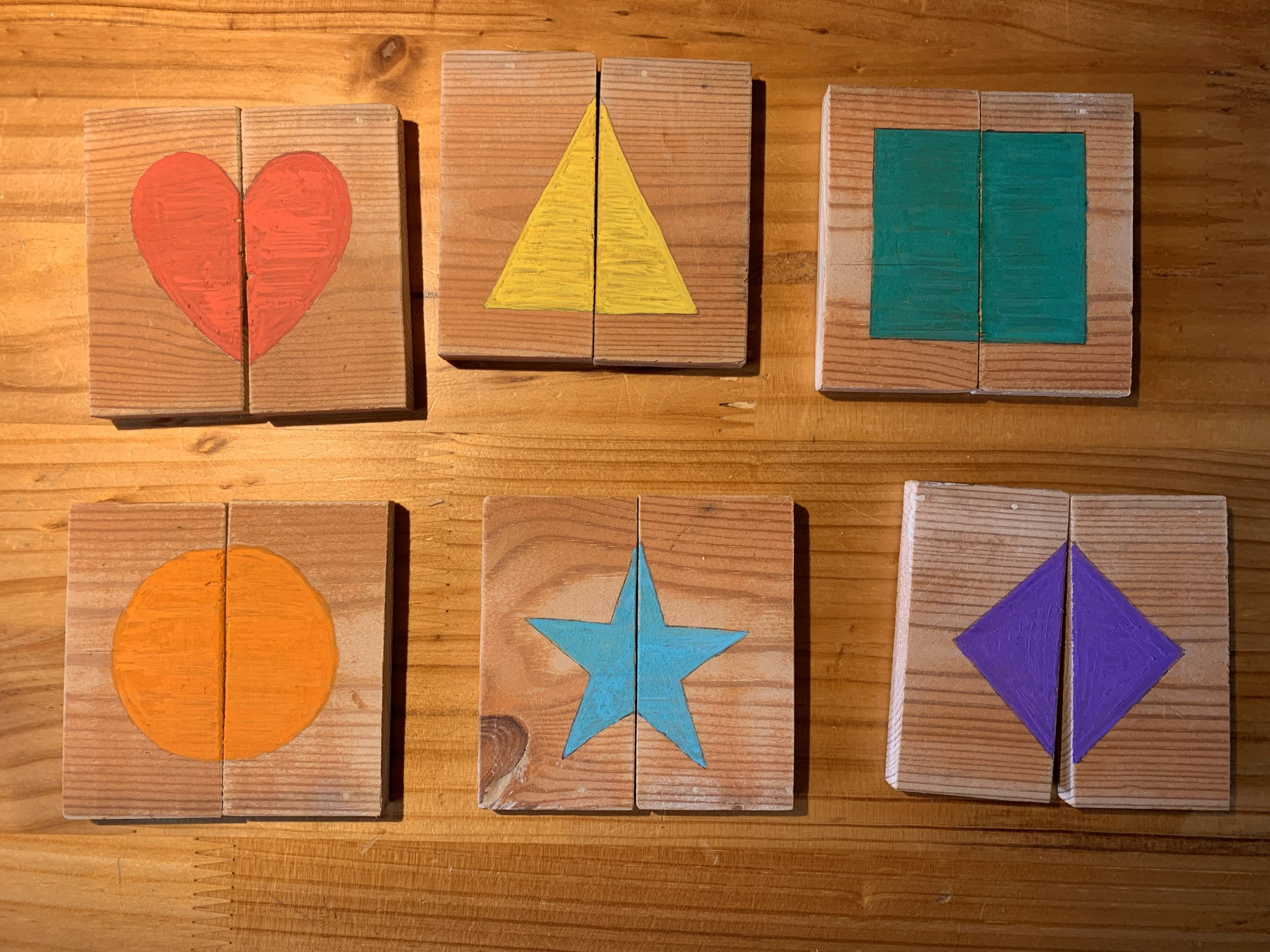 Je suis parti sur un puzzle en deux parties avec des figures géométriques simples et colorées.